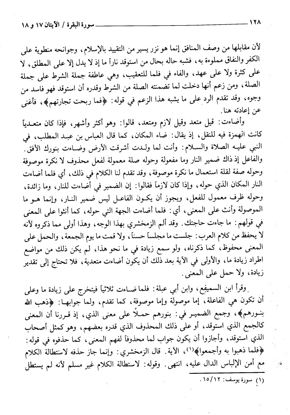 وَالْفَاعِلُ إِذْ ذَاكَ ضَمِيرُ النَّارِ وَمَا مَفْعُولَةٌ وَحَوْلَهُ صِلَةٌ مَعْمُولَةٌ لِفِعْلٍ مَحْذُوفٍ لَا نَكِرَةٍ مَوْصُوفَةٍ وَحَوْلَهُ صِفَةٌ لِقِلَّةِ اسْتِعْمَالِ مَا نَكِرَةً مَوْصُوفَةً، وَقَدْ تَقَدَّمَ لَنَا الْكَلَامُ فِي ذَلِكَ، أَيْ فَلَمَّا أَضَاءَتِ النَّارُ الْمَكَانَ الَّذِي حَوْلَهُ، وَإِذَا كَانَ لَازِمًا فَقَالُوا: إِنَّ الضَّمِيرَ فِي أَضَاءَتْ لِلنَّارِ، وَمَا زَائِدَةٌ، وَحَوْلَهُ ظَرْفٌ مَعْمُولٌ لِلْفِعْلِ، وَيَجُوزُ أَنْ يَكُونَ الْفَاعِلُ لَيْسَ ضَمِيرَ النَّارِ، وَإِنَّمَا هُوَ مَا الْمَوْصُولَةُ وَأُنِّثَ عَلَى الْمَعْنَى، أَيْ: فَلَمَّا أَضَاءَتِ الْجِهَةُ الَّتِي حَوْلَهُ، كَمَا أَنَّثُوا عَلَى الْمَعْنَى فِي قَوْلِهِمْ: مَا جَاءَتْ حَاجَتُكَ. وَقَدْ أَلَمَّ الزَّمَخْشَرِيُّ بِهَذَا الْوَجْهِ، وَهَذَا أَوْلَى مِمَّا ذَكَرُوهُ لِأَنَّهُ لَا يُحْفَظُ مِنْ كَلَامِ الْعَرَبِ: جَلَسْتُ مَا مَجْلِسًا حَسَنًا، وَلَا قُمْتُ مَا يَوْمَ الْجُمْعَةَ، وَالْحَمْلُ عَلَى الْمَعْنَى مَحْفُوظٌ، كَمَا ذَكَرْنَاهُ، وَلَوْ سُمِعَ زِيَادَةً فِي مَا نَحْوَ هَذَا، لَمْ يَكُنْ ذَلِكَ مِنْ مَوَاضِعِ اطِّرَادِ زِيَادَةِ مَا، وَالْأَوْلَى فِي الْآيَةِ بَعْدَ ذَلِكَ أَنْ يَكُونَ أَضَاءَتْ مُتَعَدِّيَةٌ، فَلَا تَحْتَاجُ إِلَى تَقْدِيرِ زِيَادَةٍ، وَلَا حَمْلٍ عَلَى الْمَعْنَى.