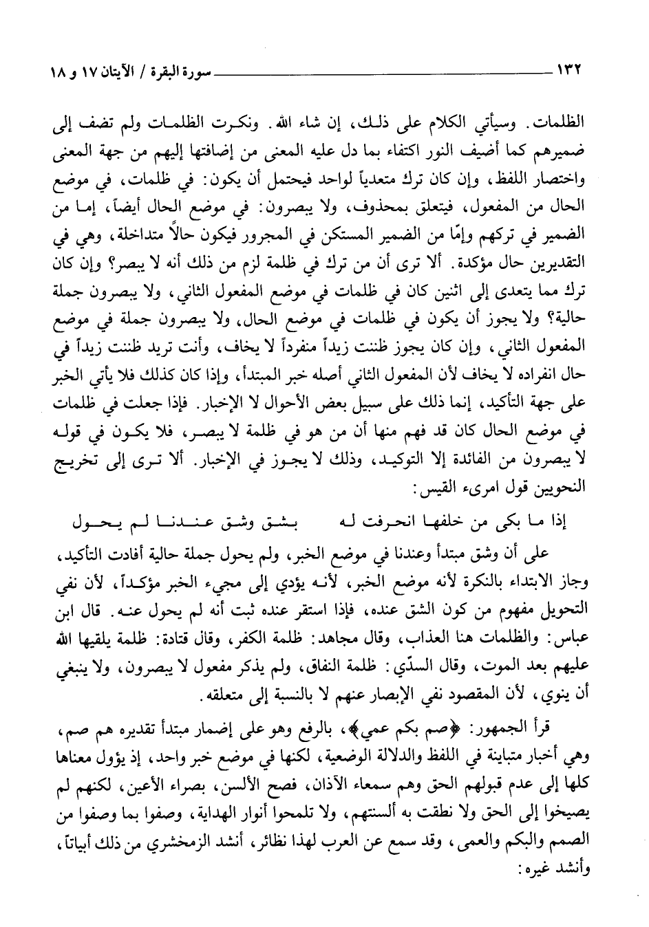 الظُّلُمَاتِ. وَسَيَأْتِي الْكَلَامُ عَلَى ذَلِكَ، إِنْ شَاءَ اللَّهُ. وَنُكِّرَتِ الظُّلُمَاتُ وَلَمْ تُضَفْ إلى ضميرهم كَمَا أُضِيفَ النُّورُ اكْتِفَاءً بِمَا دَلَّ عَلَيْهِ الْمَعْنَى مِنْ إِضَافَتِهَا إِلَيْهِمْ مِنْ جِهَةِ الْمَعْنَى وَاخْتِصَارِ اللَّفْظِ، وَإِنْ كَانَ تَرَكَ مُتَعَدِّيًا لِوَاحِدٍ فَيُحْتَمَلُ أَنْ يَكُونَ: فِي ظُلُمَاتٍ، فِي مَوْضِعِ الْحَالِ مِنَ الْمَفْعُولِ، فَيَتَعَلَّقُ بِمَحْذُوفٍ، وَلَا يُبْصِرُونَ: فِي مَوْضِعِ الْحَالِ أَيْضًا، إِمَّا مِنَ الضَّمِيرِ فِي تَرْكِهِمْ وَإِمَّا مِنَ الضَّمِيرِ الْمُسْتَكِنِّ فِي الْمَجْرُورِ فَيَكُونُ حَالًا مُتَدَاخِلَةً، وَهِيَ فِي التَّقْدِيرَيْنِ حَالٌ مُؤَكِّدَةٌ. أَلَا تَرَى أَنَّ مَنْ تُرِكَ فِي ظُلْمَةٍ لَزِمَ مِنْ ذَلِكَ أَنَّهُ لَا يُبْصِرُ؟ وَإِنْ كَانَ تَرَكَ مِمَّا يَتَعَدَّى إِلَى اثْنَيْنِ كَانَ فِي ظُلُمَاتٍ فِي مَوْضِعِ الْمَفْعُولِ الثَّانِي، وَلَا يُبْصِرُونَ جُمْلَةٌ حَالِيَّةٌ؟ وَلَا يَجُوزُ أَنْ يَكُونَ فِي ظُلُمَاتٍ فِي مَوْضِعِ الْحَالِ، وَلَا يُبْصِرُونَ جُمْلَةٌ فِي مَوْضِعِ الْمَفْعُولِ الثَّانِي، وَإِنْ كَانَ يَجُوزُ ظَنَنْتُ زَيْدًا مُنْفَرِدًا لَا يَخَافُ، وَأَنْتَ تُرِيدُ ظَنَنْتُ زَيْدًا فِي حَالِ انْفِرَادِهِ لَا يَخَافُ لِأَنَّ الْمَفْعُولَ الثاني أصله خبر الْمُبْتَدَأِ، وَإِذَا كَانَ كَذَلِكَ فَلَا يَأْتِي الْخَبَرُ عَلَى جِهَةِ التَّأْكِيدِ، إِنَّمَا ذَلِكَ عَلَى سَبِيلِ بَعْضِ الْأَحْوَالِ لَا الْأَخْبَارِ. فَإِذَا جَعَلْتَ فِي ظُلُمَاتٍ فِي مَوْضِعِ الْحَالِ كَانَ قَدْ فُهِمَ مِنْهَا أَنَّ مَنْ هُوَ فِي ظُلْمَةٍ لَا يُبْصِرُ، فَلَا يَكُونُ فِي قَوْلِهِ لَا يُبْصِرُونَ مِنَ الْفَائِدَةِ إِلَّا التَّوْكِيدُ، وَذَلِكَ لَا يَجُوزُ فِي الْأَخْبَارِ. أَلَا تَرَى إِلَى تَخْرِيجِ النَّحْوِيِّينَ قَوْلَ امْرِئِ الْقَيْسِ: