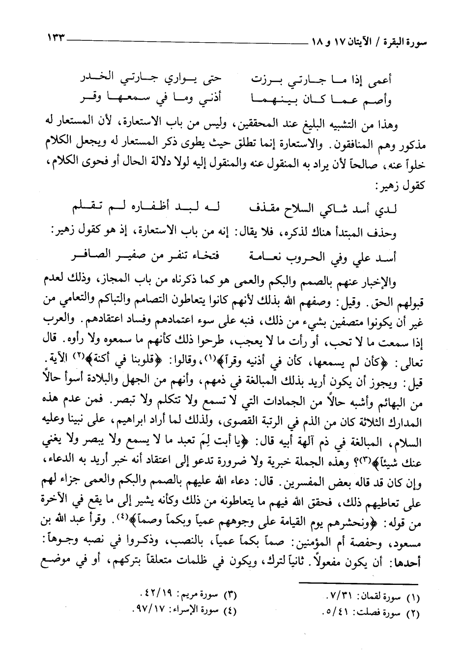 وَهَذَا مِنَ التَّشْبِيهِ الْبَلِيغِ عِنْدَ الْمُحَقِّقِينَ، وَلَيْسَ مِنْ بَابِ الِاسْتِعَارَةِ، لِأَنَّ الْمُسْتَعَارَ لَهُ مَذْكُورٌ وَهُمُ الْمُنَافِقُونَ. وَالِاسْتِعَارَةُ إِنَّمَا تُطْلَقُ حَيْثُ يُطْوَى ذِكْرُ الْمُسْتَعَارِ لَهُ وَيُجْعَلُ الْكَلَامُ خُلُوًّا عَنْهُ، صَالِحًا لِأَنْ يُرَادَ بِهِ الْمَنْقُولُ عَنْهُ وَالْمَنْقُولُ إِلَيْهِ لَوْلَا دَلَالَةُ الْحَالِ أَوْ فَحْوَى الْكَلَامِ، كَقَوْلِ زُهَيْرٍ:
