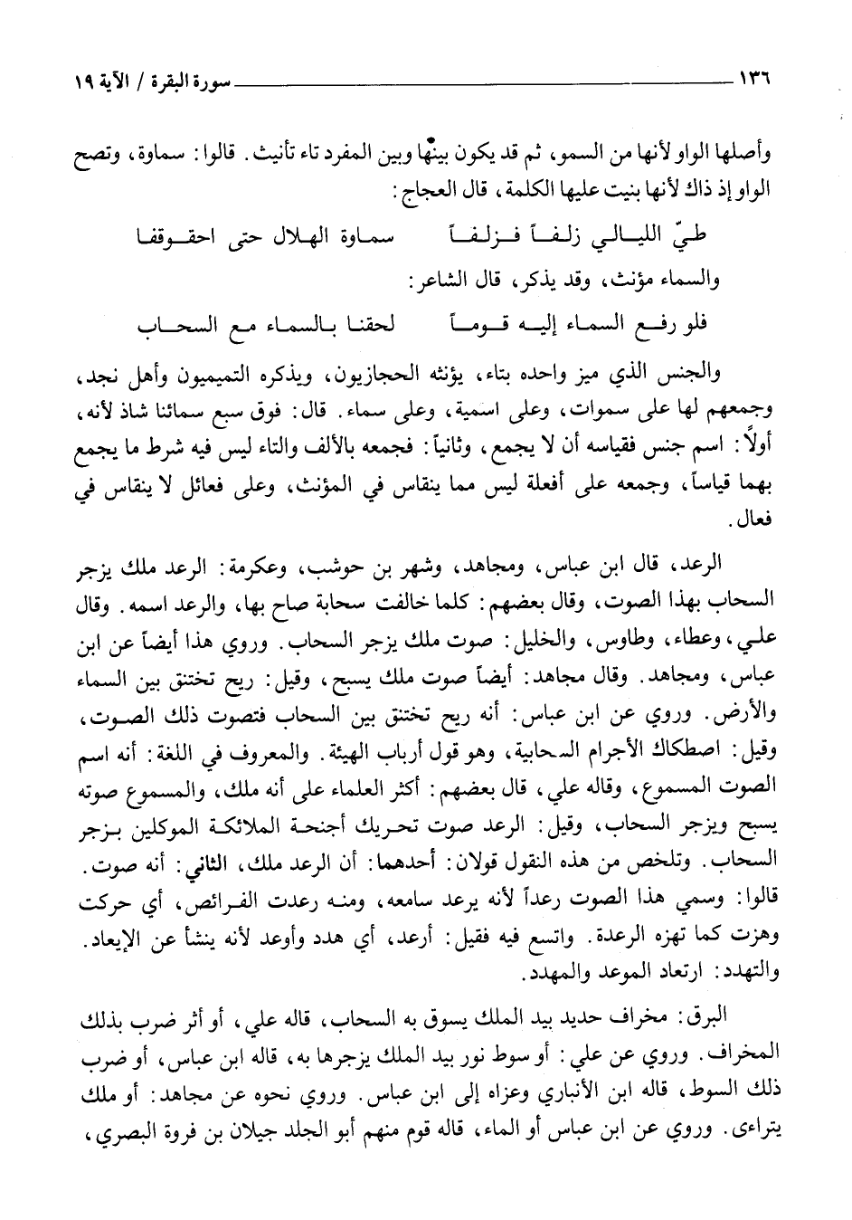 الرَّعْدُ، قَالَ ابْنُ عَبَّاسٍ، وَمُجَاهِدٌ، وَشَهْرُ بْنُ حَوْشَبٍ، وَعِكْرِمَةُ: الرَّعْدُ مَلَكٌ يَزْجُرُ السَّحَابَ بِهَذَا الصَّوْتِ، وَقَالَ بَعْضُهُمْ: كُلَّمَا خَالَفَتْ سَحَابَةٌ صَاحَ بِهَا، وَالرَّعْدُ اسْمُهُ. وَقَالَ عَلِيٌّ، وَعَطَاءٌ، وَطَاوُسٌ، وَالْخَلِيلُ: صَوْتُ مَلَكٍ يَزْجُرُ السَّحَابَ. وَرُوِيَ هَذَا أَيْضًا عَنِ ابْنِ عَبَّاسٍ، وَمُجَاهِدٍ. وَقَالَ مُجَاهِدٌ: أَيْضًا صَوْتُ مَلِكٍ يَسْبَحُ، وَقِيلَ: رِيحٌ تَخْتَنِقُ بَيْنَ السَّمَاءِ وَالْأَرْضِ. وَرُوِيَ عَنِ ابْنِ عَبَّاسٍ: أَنَّهُ رِيحٌ تَخْتَنِقُ بَيْنَ السَّحَابِ فَتُصَوِّتُ ذَلِكَ الصَّوْتَ، وَقِيلَ: اصْطِكَاكُ الْأَجْرَامِ السَّحَابِيَّةِ، وَهُوَ قَوْلُ أَرْبَابِ الْهَيْئَةِ. وَالْمَعْرُوفُ فِي اللُّغَةِ: أَنَّهُ اسْمُ الصَّوْتِ الْمَسْمُوعِ، وَقَالَهُ عَلِيٌّ، قَالَ بَعْضُهُمْ: أَكْثَرُ الْعُلَمَاءِ عَلَى أَنَّهُ مَلَكٌ، وَالْمَسْمُوعُ صَوْتُهُ يُسَبِّحُ وَيَزْجُرُ السَّحَابَ، وَقِيلَ: الرَّعْدُ صَوْتُ تَحْرِيكِ أَجْنِحَةِ الْمَلَائِكَةِ الْمُوَكَّلِينَ بِزَجْرِ السَّحَابِ. وَتَلَخَّصَ مِنْ هَذِهِ النُّقُولِ قَوْلَانِ: أَحَدُهُمَا: أَنَّ الرَّعْدَ مَلَكٌ، الثَّانِي: أَنَّهُ صَوتٌ.