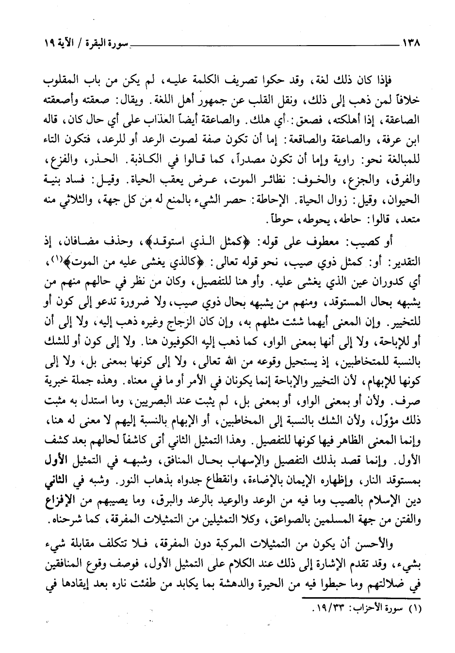 أَوْ كَصَيِّبٍ: مَعْطُوفٌ عَلَى قَوْلِهِ: كَمَثَلِ الَّذِي اسْتَوْقَدَ، وَحَذْفُ مُضَافَانِ، إِذِ التَّقْدِيرُ: أَوْ: كَمَثَلِ ذَوِي صَيِّبٍ، نَحْوَ قَوْلِهِ تَعَالَى: كَالَّذِي يُغْشى عَلَيْهِ مِنَ الْمَوْتِ «1» ، أَيْ كَدَوَرَانِ عَيْنِ الَّذِي يُغْشَى عَلَيْهِ. وَأَوْ هُنَا لِلتَّفْصِيلِ، وَكَانَ مَنْ نَظَرَ فِي حَالِهِمْ مِنْهُمْ مَنْ يُشَبِّهُهُ بِحَالِ الْمُسْتَوْقِدِ، وَمِنْهُمْ مَنْ يُشَبِّهُهُ بِحَالِ ذَوِي صَيِّبٍ، وَلَا ضَرُورَةَ تَدْعُو إِلَى كَوْنِ أَوْ لِلتَّخْيِيرِ. وَأَنَّ الْمَعْنَى أَيُّهُمَا شِئْتَ مَثِّلْهُمْ بِهِ، وَإِنْ كَانَ الزَّجَّاجُ وَغَيْرُهُ ذَهَبَ إِلَيْهِ، وَلَا إِلَى أَنَّ أَوْ لِلْإِبَاحَةِ، وَلَا إِلَى أَنَّهَا بِمَعْنَى الْوَاوِ، كَمَا ذَهَبَ إِلَيْهِ الْكُوفِيُّونَ هُنَا. وَلَا إِلَى كَوْنِ أَوْ لِلشَّكِّ بِالنِّسْبَةِ للمتخاطبين، إِذْ يَسْتَحِيلُ وُقُوعُهُ مِنَ اللَّهِ تَعَالَى، وَلَا إِلَى كَوْنِهَا بِمَعْنَى بَلْ، وَلَا إِلَى كَوْنِهَا لِلْإِبْهَامِ، لِأَنَّ التَّخْيِيرَ وَالْإِبَاحَةَ إِنَّمَا يَكُونَانِ فِي الْأَمْرِ أَوْ مَا فِي مَعْنَاهُ. وَهَذِهِ جُمْلَةٌ خَبَرِيَّةٌ صِرْفٌ. وَلِأَنَّ أَوْ بِمَعْنَى الْوَاوِ، أَوْ بِمَعْنَى بَلْ، لَمْ يَثْبُتْ عِنْدَ الْبَصْرِيِّينَ، وَمَا اسْتَدَلَّ بِهِ مُثْبِتُ ذَلِكَ مُؤَوَّلٌ، وَلِأَنَّ الشَّكَّ بِالنِّسْبَةِ إِلَى الْمُخَاطَبِينَ، أَوِ الْإِبْهَامَ بِالنِّسْبَةِ إِلَيْهِمْ لَا مَعْنًى لَهُ هُنَا، وَإِنَّمَا الْمَعْنَى الظَّاهِرُ فِيهَا كَوْنُهَا لِلتَّفْصِيلِ. وَهَذَا التَّمْثِيلُ الثَّانِي أَتَى كَاشِفًا لِحَالِهِمْ بَعْدَ كَشْفِ الْأَوَّلِ. وَإِنَّمَا قَصَدَ بِذَلِكَ التَّفْصِيلَ وَالْإِسْهَابَ بِحَالِ الْمُنَافِقِ، وَشَبَّهَهَ فِي التَّمْثِيلِ الْأَوَّلِ بِمُسْتَوْقِدِ النَّارِ، وَإِظْهَارُهُ الْإِيمَانُ بِالْإِضَاءَةِ، وَانْقِطَاعُ جَدْوَاهُ بِذَهَابِ النُّورِ. وَشَبَّهَ فِي الثَّانِي دِينَ الْإِسْلَامِ بِالصَّيِّبِ وَمَا فِيهِ مِنَ الْوَعْدِ وَالْوَعِيدِ بِالرَّعْدِ وَالْبَرْقِ، وَمَا يُصِيبُهُمْ مِنَ الْإِفْزَاعِ وَالْفِتَنِ مِنْ جِهَةِ الْمُسْلِمِينَ بِالصَّوَاعِقِ، وَكِلَا التَّمْثِيلَيْنِ مِنَ التَّمْثِيلَاتِ الْمُفَرَّقَةُ، كَمَا شَرَحْنَاهُ.