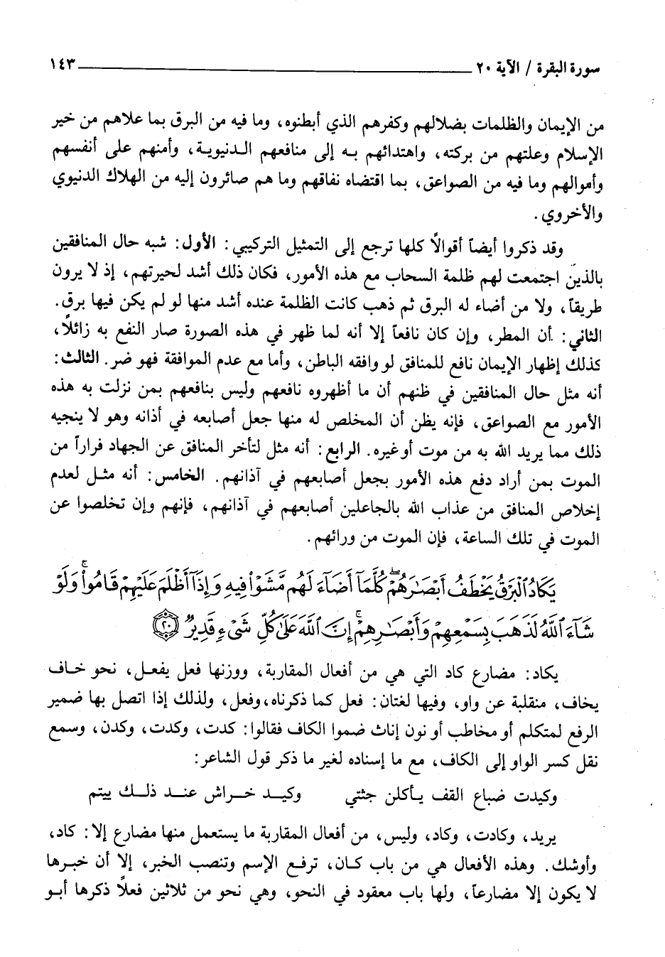 يَكادُ الْبَرْقُ يَخْطَفُ أَبْصارَهُمْ كُلَّما أَضاءَ لَهُمْ مَشَوْا فِيهِ وَإِذا أَظْلَمَ عَلَيْهِمْ قامُوا وَلَوْ شاءَ اللَّهُ لَذَهَبَ بِسَمْعِهِمْ وَأَبْصارِهِمْ إِنَّ اللَّهَ عَلى كُلِّ شَيْءٍ قَدِيرٌ (20)