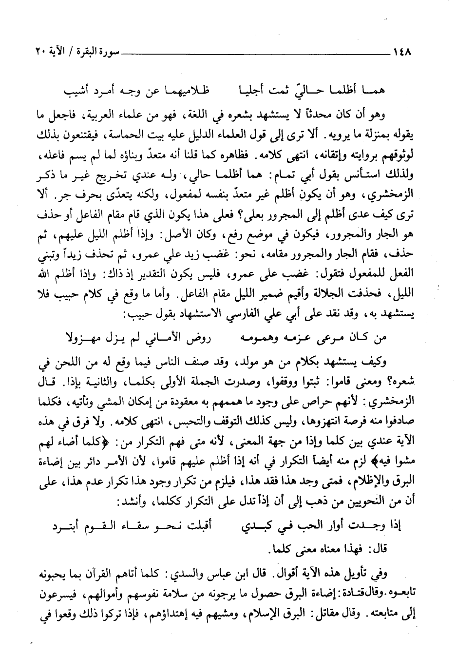 وَكَيْفَ يُسْتَشْهَدُ بِكَلَامِ مَنْ هُوَ مُوَلِّدٌ، وَقَدْ صَنَّفَ النَّاسُ فِيمَا وَقَعَ لَهُ مِنَ اللَّحْنِ فِي شِعْرِهِ؟ وَمَعْنَى قَامُوا: ثَبَتُوا وَوَقَفُوا، وَصُدِّرَتِ الْجُمْلَةُ الْأُولَى بِكُلَّمَا، وَالثَّانِيَةُ بِإِذَا. قَالَ الزَّمَخْشَرِيُّ: لِأَنَّهُمْ حُرَّاصٌ عَلَى وُجُودِ مَا هِمَمُهُمْ بِهِ مَعْقُودَةٌ مِنْ إِمْكَانِ الْمَشْيِ وَتَأْتِيهِ، فَكُلَّمَا صَادَفُوا مِنْهُ فُرْصَةً انْتَهَزُوهَا، وَلَيْسَ كَذَلِكَ التَّوَقُّفُ وَالتَّحَبُّسُ، انْتَهَى كَلَامُهُ. وَلَا فَرْقَ فِي هَذِهِ الْآيَةِ عِنْدِي بَيْنَ كُلَّمَا وَإِذَا مِنْ جِهَةِ الْمَعْنَى، لِأَنَّهُ مَتَى فُهِمَ التَّكْرَارُ مِنْ: كُلَّما أَضاءَ لَهُمْ مَشَوْا فِيهِ لَزِمَ مِنْهُ أَيْضًا التَّكْرَارُ فِي أَنَّهُ إِذَا أَظْلَمَ عَلَيْهِمْ قَامُوا، لِأَنَّ الْأَمْرَ دَائِرٌ بَيْنَ إِضَاءَةِ الْبَرْقِ وَالْإِظْلَامِ، فَمَتَى وُجِدَ هَذَا فُقِدَ هَذَا، فَيَلْزَمُ مِنْ تَكْرَارِ وُجُودِ هَذَا تَكْرَارِ عَدَمِ هَذَا، عَلَى أَنَّ مِنَ النَّحْوِيِّينَ مَنْ ذَهَبَ إِلَى أَنَّ إِذَا تَدُلُّ عَلَى التَّكْرَارِ كَكُلَّمَا، وَأَنْشَدَ:
