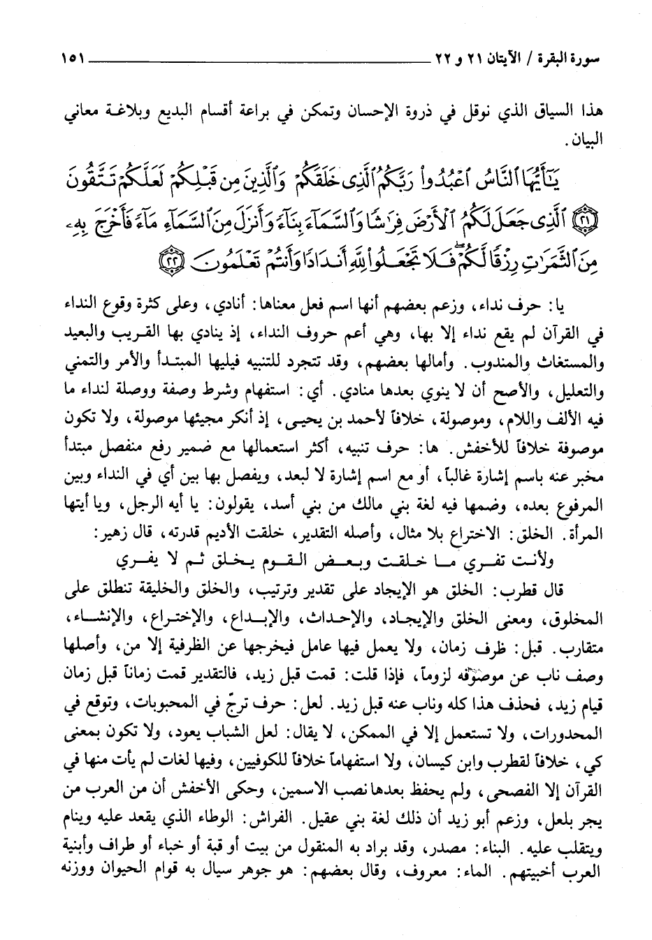يَا أَيُّهَا النَّاسُ اعْبُدُوا رَبَّكُمُ الَّذِي خَلَقَكُمْ وَالَّذِينَ مِنْ قَبْلِكُمْ لَعَلَّكُمْ تَتَّقُونَ (21) الَّذِي جَعَلَ لَكُمُ الْأَرْضَ فِراشاً وَالسَّماءَ بِناءً وَأَنْزَلَ مِنَ السَّماءِ مَاءً فَأَخْرَجَ بِهِ مِنَ الثَّمَراتِ رِزْقاً لَكُمْ فَلا تَجْعَلُوا لِلَّهِ أَنْداداً وَأَنْتُمْ تَعْلَمُونَ (22)