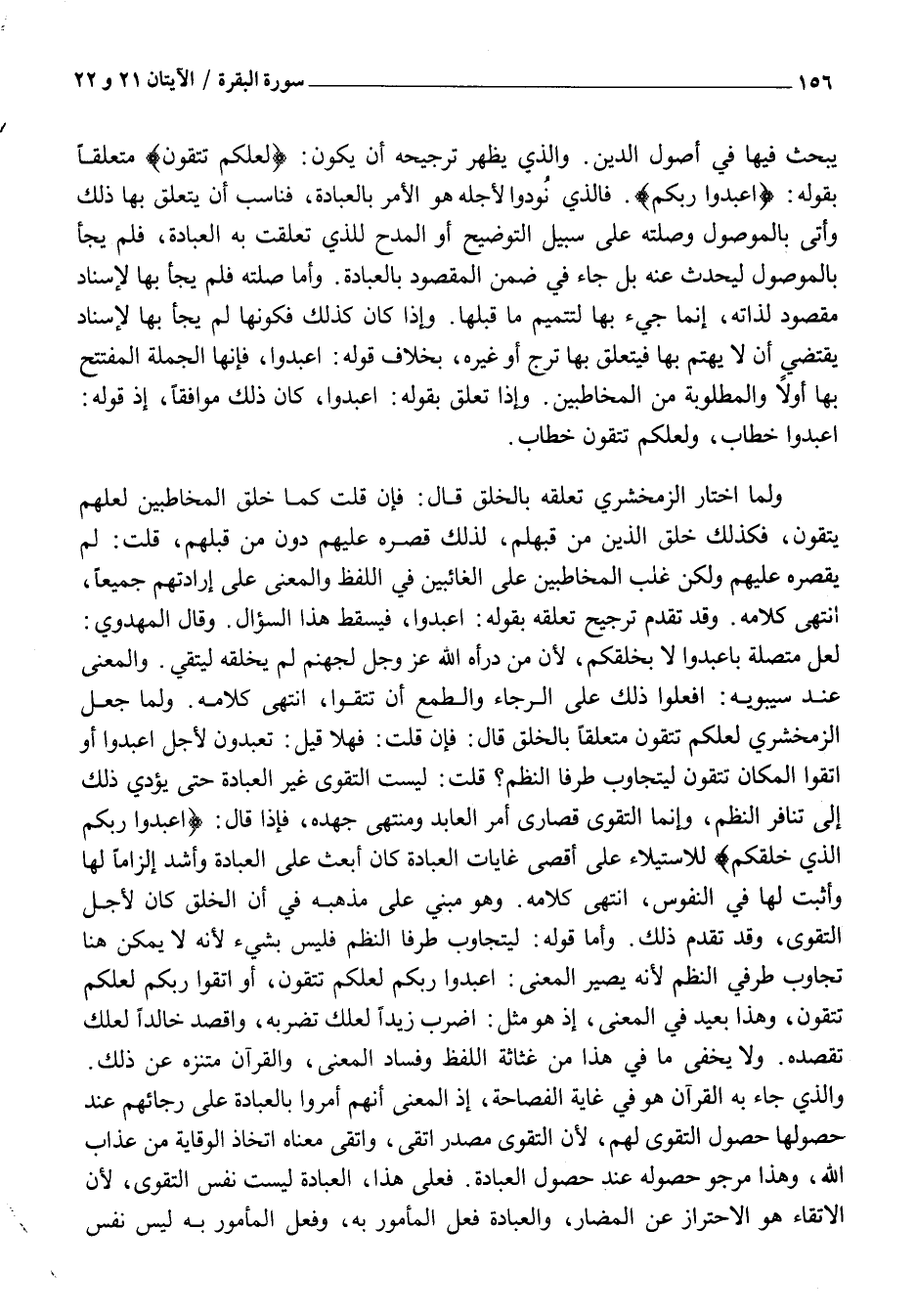 يُبْحَثُ فِيهَا فِي أُصُولِ الدِّينِ. وَالَّذِي يَظْهَرُ تَرْجِيحُهُ أَنْ يَكُونَ: لَعَلَّكُمْ تَتَّقُونَ مُتَعَلِّقًا بِقَوْلِهِ: اعْبُدُوا رَبَّكُمُ. فَالَّذِي نُودُوا لِأَجْلِهِ هُوَ الْأَمْرُ بِالْعِبَادَةِ، فَنَاسَبَ أَنْ يَتَعَلَّقَ بِهَا ذَلِكَ وَأَتَى بِالْمَوْصُولِ وَصِلَتِهِ عَلَى سَبِيلِ التَّوْضِيحِ أَوِ الْمَدْحِ لِلَّذِي تَعَلَّقَتْ بِهِ الْعِبَادَةُ، فَلَمْ يجأ بِالْمَوْصُولِ لِيُحَدِّثَ عَنْهُ بَلْ جَاءَ فِي ضِمْنِ الْمَقْصُودِ بِالْعِبَادَةِ. وَأَمَّا صِلَتُهُ فَلَمْ يجأ بِهَا لِإِسْنَادٍ مَقْصُودٍ لِذَاتِهِ، إِنَّمَا جِيءَ بِهَا لِتَتْمِيمِ مَا قَبْلَهَا. وَإِذَا كَانَ كذلك فكونها لم يجأ بِهَا لِإِسْنَادٍ يَقْتَضِي أَنْ لَا يُهْتَمَّ بِهَا فَيَتَعَلَّقُ بِهَا تَرَجٍّ أَوْ غَيْرُهُ، بِخِلَافِ قَوْلِهِ: اعْبُدُوا، فَإِنَّهَا الْجُمْلَةُ الْمُفْتَتَحُ بِهَا أَوَّلًا وَالْمَطْلُوبَةُ مِنَ الْمُخَاطَبِينَ. وَإِذَا تَعَلَّقَ بِقَوْلِهِ: اعْبُدُوا، كَانَ ذَلِكَ مُوَافِقًا، إِذْ قَوْلُهُ: