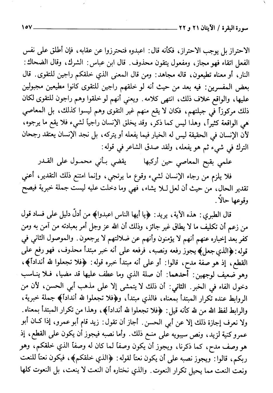 قَالَ الطَّبَرِيُّ: هذه الآية، يريد: يَا أَيُّهَا النَّاسُ اعْبُدُوا مِنْ أَدَلِّ دَلِيلٍ عَلَى فَسَادِ قَوْلِ مَنْ زَعَمَ أَنَّ تَكْلِيفَ مَا لَا يُطَاقُ غَيْرُ جَائِزٍ، وَذَلِكَ أَنَّ اللَّهَ عَزَّ وَجَلَّ أَمَرَ بِعِبَادَتِهِ مَنْ آمَنَ بِهِ وَمَنْ كَفَرَ بَعْدَ إِخْبَارِهِ عَنْهُمْ أَنَّهُمْ لَا يُؤْمِنُونَ وَأَنَّهُمْ عَنْ ضَلَالَتِهِمْ لَا يَرْجِعُونَ. وَالْمَوْصُولُ الثَّانِي فِي قَوْلِهِ: الَّذِي جَعَلَ يَجُوزُ رَفْعُهُ وَنَصْبُهُ، فَرَفْعُهُ عَلَى أَنَّهُ خَبَرُ مُبْتَدَأٍ مَحْذُوفٍ، فَهُوَ رَفْعٌ عَلَى الْقَطْعِ، إِذْ هُوَ صِفَةُ مَدْحٍ، قَالُوا: أَوْ عَلَى أَنَّهُ مُبْتَدَأٌ خَبَرُهُ قَوْلُهُ: فَلا تَجْعَلُوا لِلَّهِ أَنْداداً، وَهُوَ ضَعِيفٌ لِوَجْهَيْنِ: أَحَدُهُمَا: أَنَّ صِلَةَ الَّذِي وَمَا عَطَفَ عَلَيْهَا قَدْ مَضَيَا، فَلَا يُنَاسِبُ دُخُولَ الْفَاءِ فِي الْخَبَرِ. الثَّانِي: أَنَّ ذَلِكَ لَا يَتَمَشَّى إِلَّا عَلَى مَذْهَبِ أَبِي الْحَسَنِ، لِأَنَّ مِنَ الرَّوَابِطِ عِنْدَهُ تَكْرَارُ الْمُبْتَدَأِ بِمَعْنَاهُ، فَالَّذِي مُبْتَدَأٌ، وفَلا تَجْعَلُوا لِلَّهِ أَنْداداً جُمْلَةٌ خَبَرِيَّةٌ، وَالرَّابِطُ لَفْظُ اللَّهِ مِنْ لِلَّهِ كَأَنَّهُ قِيلَ: فَلا تَجْعَلُوا لِلَّهِ أَنْداداً، وَهَذَا مِنْ تَكْرَارِ الْمُبْتَدَأِ بِمَعْنَاهُ.
