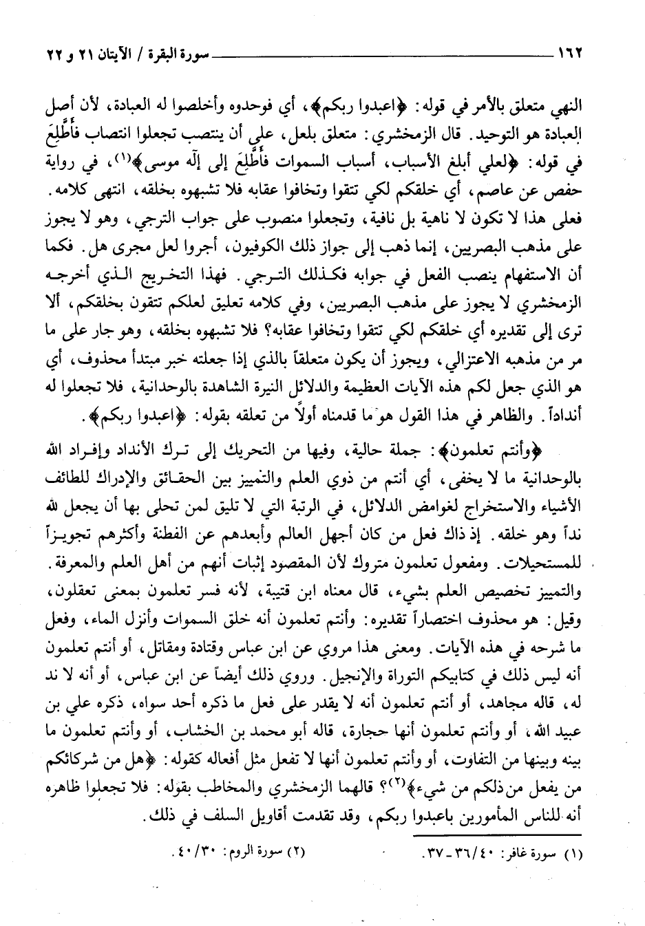 فَعَلَى هَذَا لَا تَكُونُ لَا نَاهِيَةً بَلْ نَافِيَةً، وَتَجْعَلُوا مَنْصُوبٌ عَلَى جَوَابِ التَّرَجِّي، وَهُوَ لَا يَجُوزُ عَلَى مَذْهَبِ الْبَصْرِيِّينَ، إِنَّمَا ذَهَبَ إِلَى جَوَازِ ذَلِكَ الْكُوفِيُّونَ، أَجْرَوْا لَعَلَّ مَجْرَى هَلْ. فَكَمَا أَنَّ الِاسْتِفْهَامَ يَنْصِبُ الْفِعْلَ فِي جَوَابِهِ فَكَذَلِكَ التَّرَجِّي. فَهَذَا التَّخْرِيجُ الَّذِي أَخْرَجَهُ الزَّمَخْشَرِيُّ لَا يَجُوزُ عَلَى مَذْهَبِ الْبَصْرِيِّينَ، وَفِي كَلَامِهِ تَعْلِيقُ لَعَلَّكُمْ تَتَّقُونَ بِخَلَقَكُمْ، أَلَا تَرَى إِلَى تَقْدِيرِهِ أَيْ خَلَقَكُمْ لِكَيْ تَتَّقُوا وَتَخَافُوا عِقَابَهُ؟ فَلَا تُشَبِّهُوهُ بِخَلْقِهِ، وَهُوَ جَارٍ عَلَى مَا مَرَّ مِنْ مَذْهَبِهِ الِاعْتِزَالِيِّ، وَيَجُوزُ أَنْ يَكُونَ مُتَعَلِّقًا بِالَّذِي إِذَا جَعَلْتَهُ خبر مبتدأ محذوف، أي هُوَ الَّذِي جَعَلَ لَكُمُ هَذِهِ الْآيَاتِ الْعَظِيمَةِ وَالدَّلَائِلِ النَّيِّرَةِ الشَّاهِدَةِ بِالْوَحْدَانِيَّةِ، فَلَا تَجْعَلُوا لَهُ أَنْدَادًا. وَالظَّاهِرُ فِي هَذَا الْقَوْلِ هُوَ مَا قَدَّمْنَاهُ أَوَّلًا مِنْ تَعَلُّقِهِ بِقَوْلِهِ: اعْبُدُوا رَبَّكُمُ.