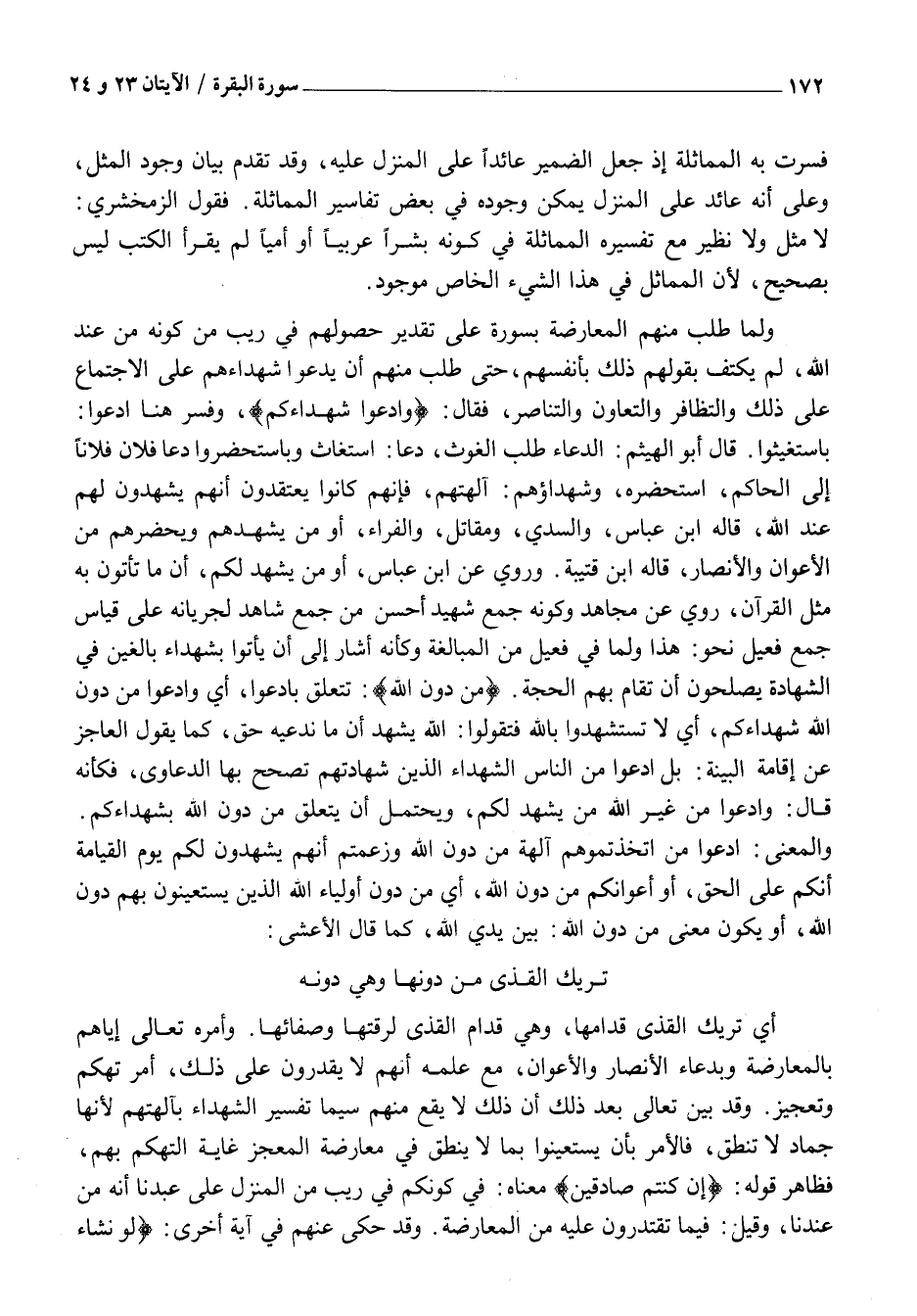 تُرِيكَ الْقَذَى مِنْ دُونِهَا وَهْيَ دُونَهُ أَيْ تُرِيكَ الْقَذَى قُدَّامَهَا، وَهِيَ قُدَّامُ الْقَذَى لِرِقَّتِهَا وَصَفَائِهَا. وَأَمْرُهُ تَعَالَى إِيَّاهُمْ بِالْمُعَارَضَةِ وَبِدُعَاءِ الْأَنْصَارِ وَالْأَعْوَانِ، مَعَ عِلْمِهِ أَنَّهُمْ لَا يَقْدِرُونَ عَلَى ذَلِكَ، أَمْرُ تَهَكُّمٍ وَتَعْجِيزٍ. وَقَدْ بَيَّنَ تَعَالَى بَعْدَ ذَلِكَ أَنَّ ذَلِكَ لَا يَقَعُ مِنْهُمْ سِيَّمَا تَفْسِيرُ الشُّهَدَاءِ بِآلِهَتِهِمْ لِأَنَّهَا جَمَادٌ لَا تَنْطِقُ، فَالْأَمْرُ بِأَنْ يَسْتَعِينُوا بِمَا لَا يَنْطِقُ فِي مُعَارَضَةِ الْمُعْجِزِ غَايَةُ التَّهَكُّمِ بِهِمْ، فَظَاهِرُ قَوْلِهِ: إِنْ كُنْتُمْ صادِقِينَ مَعْنَاهُ: فِي كَوْنِكُمْ فِي رَيْبٍ مِنَ الْمُنَزَّلِ عَلَى عَبْدِنَا أَنَّهُ مِنْ عِنْدِنَا، وَقِيلَ: فِيمَا تَقْتَدِرُونَ عَلَيْهِ مِنَ الْمُعَارَضَةِ. وَقَدْ حَكَى عَنْهُمْ فِي آيَةٍ أُخْرَى: لَوْ نَشاءُ