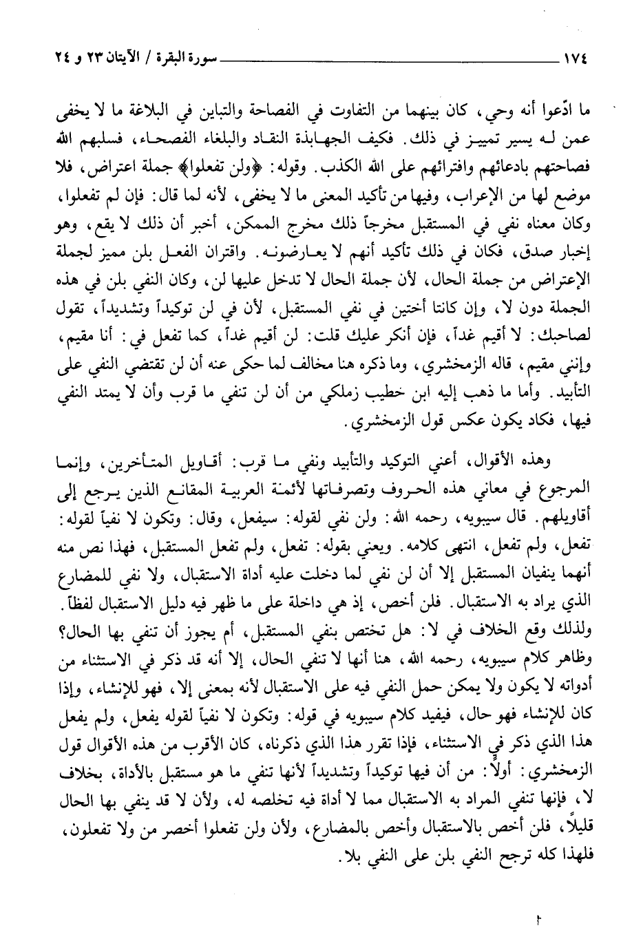 وَظَاهِرُ كَلَامِ سِيبَوَيْهِ، رَحِمَهُ اللَّهُ، هُنَا أَنَّهَا لَا تَنْفِي الْحَالَ، إِلَّا أَنَّهُ قَدْ ذَكَرَ فِي الِاسْتِثْنَاءِ مِنْ أَدَوَاتِهِ لَا يَكُونُ وَلَا يُمْكِنُ حَمْلُ النَّفْيِ فِيهِ عَلَى الِاسْتِقْبَالِ لِأَنَّهُ بِمَعْنَى إِلَّا، فَهُوَ لِلْإِنْشَاءِ، وَإِذَا كَانَ لِلْإِنْشَاءِ فَهُوَ حَالٌ، فَيُفِيدُ كَلَامَ سِيبَوَيْهِ فِي قَوْلِهِ: وَتَكُونُ لَا نَفْيًا لِقَوْلِهِ يَفْعَلُ، وَلَمْ يَفْعَلْ هَذَا الَّذِي ذُكِرَ فِي الِاسْتِثْنَاءِ، فَإِذَا تَقَرَّرَ هَذَا الَّذِي ذَكَرْنَاهُ، كَانَ الْأَقْرَبُ مِنْ هَذِهِ الْأَقْوَالِ قَوْلُ الزَّمَخْشَرِيِّ: أَوَّلًا: مِنْ أَنَّ فِيهَا تَوْكِيدًا وَتَشْدِيدًا لِأَنَّهَا تَنْفِي مَا هُوَ مُسْتَقْبَلٌ بِالْأَدَاةِ، بِخِلَافِ لَا، فَإِنَّهَا تَنْفِي الْمُرَادَ بِهِ الِاسْتِقْبَالُ مِمَّا لَا أَدَاةَ فِيهِ تُخَلِّصُهُ لَهُ، وَلِأَنَّ لَا قَدْ يُنْفَى بِهَا الْحَالُ قَلِيلًا، فَلَنْ أَخَصُّ بِالِاسْتِقْبَالِ وَأَخَصُّ بِالْمُضَارِعِ، وَلِأَنَّ وَلَنْ تَفْعَلُوا أَخْصَرُ مِنْ وَلَا تفعلون، فلهذا كله ترجح النَّفْيِ بِلَنْ عَلَى النَّفْيِ بِلَا.