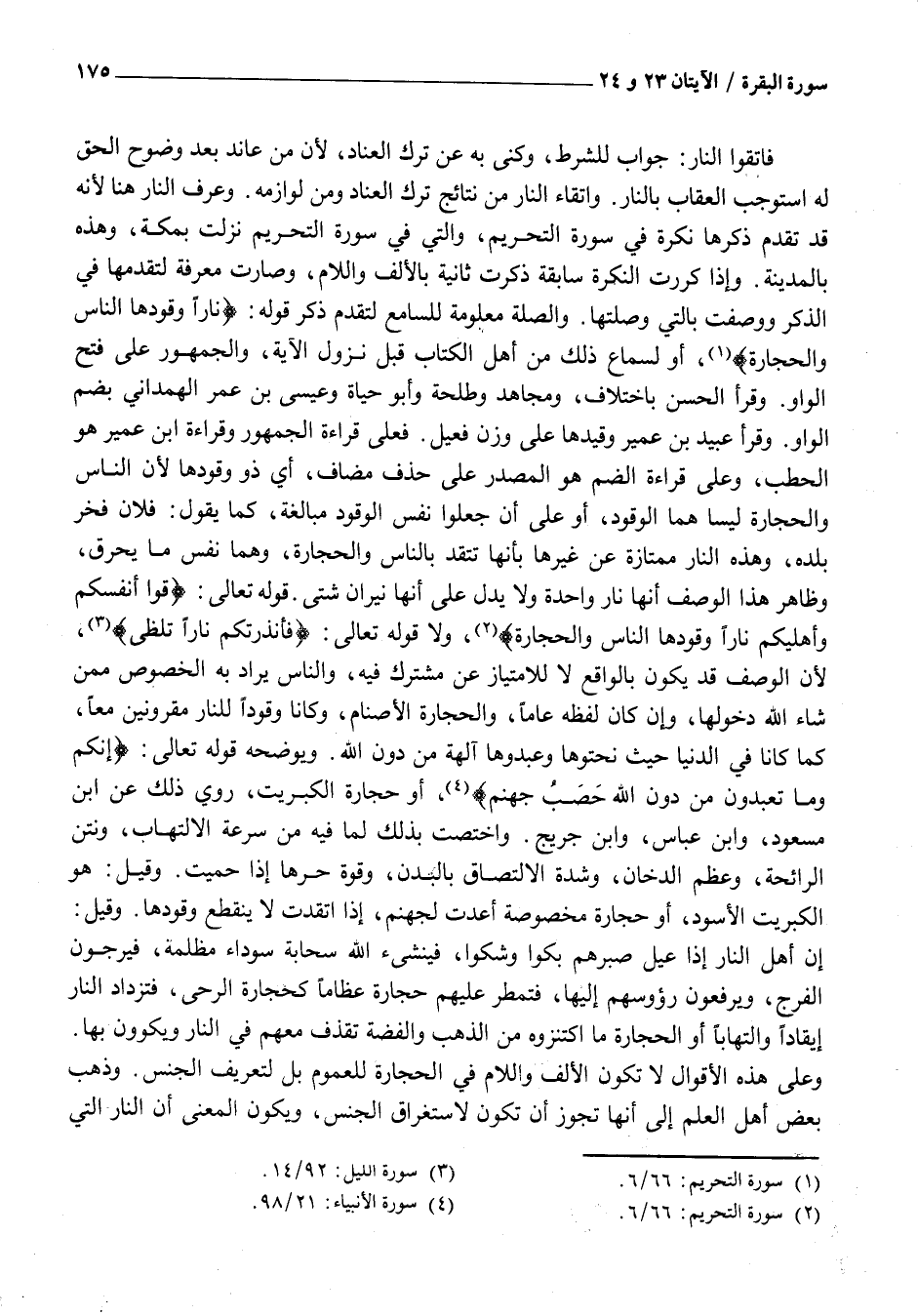 فَاتَّقُوا النَّارَ: جَوَابٌ لِلشَّرْطِ، وَكَنَّى بِهِ عَنْ تَرْكِ العناد، لأن من عائد بَعْدَ وُضُوحِ الْحَقِّ لَهُ اسْتَوْجَبَ الْعِقَابَ بِالنَّارِ. وَاتِّقَاءُ النَّارِ مِنْ نَتَائِجِ تَرْكِ الْعِنَادِ وَمِنْ لَوَازِمِهِ. وَعَرَّفَ النَّارَ هُنَا لِأَنَّهُ قَدْ تَقَدَّمَ ذِكْرُهَا نَكِرَةً فِي سُورَةِ التَّحْرِيمِ، وَالَّتِي فِي سُورَةِ التَّحْرِيمِ نَزَلَتْ بِمَكَّةَ، وَهَذِهِ بِالْمَدِينَةِ. وَإِذَا كُرِّرَتِ النَّكِرَةُ سَابِقَةً ذُكِرَتْ ثَانِيَةً بِالْأَلِفِ وَاللَّامِ، وَصَارَتْ مَعْرِفَةً لِتَقَدُّمِهَا فِي الذِّكْرِ وَوُصِفَتْ بِالَّتِي وَصِلَتِهَا. وَالصِّلَةُ مَعْلُومَةٌ لِلسَّامِعِ لِتَقَدُّمِ ذِكْرِ قَوْلِهِ: نَارًا وَقُودُهَا النَّاسُ وَالْحِجارَةُ «1» ، أَوْ لِسَمَاعِ ذَلِكَ مِنْ أَهْلِ الْكِتَابِ قَبْلَ نُزُولِ الْآيَةِ، وَالْجُمْهُورُ عَلَى فَتْحِ الْوَاوِ. وَقَرَأَ الْحَسَنُ بِاخْتِلَافٍ، وَمُجَاهِدٌ وَطَلْحَةُ وَأَبُو حَيَاةَ وَعِيسَى بْنُ عُمَرَ الْهَمْدَانِيُّ بِضَمِّ الْوَاوِ. وَقَرَأَ عُبَيْدُ بْنُ عُمَيْرٍ وَقَيَّدَهَا عَلَى وَزْنِ فَعِيلٍ. فَعَلَى قِرَاءَةِ الْجُمْهُورِ وَقِرَاءَةِ ابْنِ عُمَيْرٍ هُوَ الْحَطَبُ، وَعَلَى قِرَاءَةِ الضَّمِّ هُوَ الْمَصْدَرُ عَلَى حَذْفِ مُضَافٍ، أَيْ ذُو وَقُودِهَا لِأَنَّ النَّاسَ وَالْحِجَارَةَ لَيْسَا هُمَا الْوَقُودَ، أَوْ عَلَى أَنْ جُعِلُوا نَفْسَ الْوَقُودِ مُبَالَغَةً، كَمَا يَقُولُ: فُلَانٌ فَخْرُ بَلَدِهِ، وَهَذِهِ النَّارُ مُمْتَازَةٌ عَنْ غَيْرِهَا بِأَنَّهَا تَتَّقِدُ بِالنَّاسِ وَالْحِجَارَةِ، وَهُمَا نَفْسُ مَا يُحْرَقُ، وَظَاهِرُ هَذَا الْوَصْفِ أَنَّهَا نَارٌ وَاحِدَةٌ وَلَا يَدُلُّ عَلَى أَنَّهَا نِيرَانٌ شَتَّى. قَوْلُهُ تَعَالَى: قُوا أَنْفُسَكُمْ وَأَهْلِيكُمْ نَارًا وَقُودُهَا النَّاسُ وَالْحِجارَةُ «2» ، وَلَا قَوْلُهُ تَعَالَى: فَأَنْذَرْتُكُمْ نَارًا تَلَظَّى «3» ، لِأَنَّ الْوَصْفَ قَدْ يَكُونُ بِالْوَاقِعِ لَا لِلِامْتِيَازِ عَنْ مُشْتَرَكٍ فِيهِ، وَالنَّاسُ يُرَادُ بِهِ الْخُصُوصُ مِمَّنْ شَاءَ اللَّهُ دُخُولَهَا، وَإِنْ كَانَ لَفْظُهُ عَامًّا، وَالْحِجَارَةُ الْأَصْنَامُ، وَكَانَا وَقُودًا لِلنَّارِ مَقْرُونَيْنِ مَعًا، كَمَا كَانَا فِي الدُّنْيَا حَيْثُ نَحَتُوهَا وَعَبَدُوهَا آلِهَةً مِنْ دُونِ اللَّهِ. وَيُوَضِّحُهُ قَوْلُهُ تَعَالَى: إِنَّكُمْ وَما تَعْبُدُونَ مِنْ دُونِ اللَّهِ حَصَبُ جَهَنَّمَ «4» ، أَوْ حِجَارَةُ الْكِبْرِيتِ، رُوِيَ ذَلِكَ عَنِ ابْنِ مَسْعُودٍ، وَابْنُ عَبَّاسٍ، وَابْنِ جُرَيْجٍ. وَاخْتَصَّتْ بِذَلِكَ لِمَا فِيهِ مِنْ سُرْعَةِ الِالْتِهَابِ، وَنَتَنِ الرَّائِحَةِ، وَعِظَمِ الدُّخَانِ، وَشِدَّةِ الِالْتِصَاقِ بِالْبَدَنِ، وَقُوَّةِ حَرِّهَا إِذَا حَمِيَتْ. وَقِيلَ: هُوَ الْكِبْرِيتُ الْأَسْوَدُ، أَوْ حِجَارَةٌ مَخْصُوصَةٌ أُعِدَّتْ لِجَهَنَّمَ، إِذَا اتَّقَدَتْ لَا يَنْقَطِعُ وَقُودُهَا. وَقِيلَ: