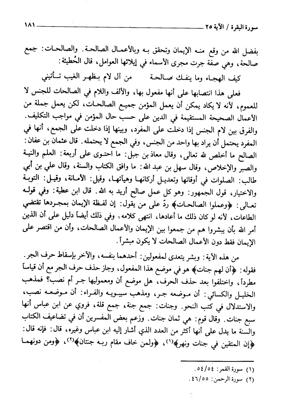 فَعَلَى هَذَا انْتِصَابُهَا عَلَى أَنَّهَا مَفْعُولٌ بِهَا، وَالْأَلِفُ وَاللَّامُ فِي الصَّالِحَاتِ لِلْجِنْسِ لَا لِلْعُمُومِ، لِأَنَّهُ لَا يَكَادُ يُمْكِنُ أَنْ يَعْمَلَ الْمُؤْمِنُ جَمِيعَ الصَّالِحَاتِ، لَكِنْ يَعْمَلُ جُمْلَةً مِنَ الْأَعْمَالِ الصَّحِيحَةِ الْمُسْتَقِيمَةِ فِي الدِّينِ عَلَى حَسَبِ حَالِ الْمُؤْمِنِ فِي مَوَاجِبِ التَّكْلِيفِ.