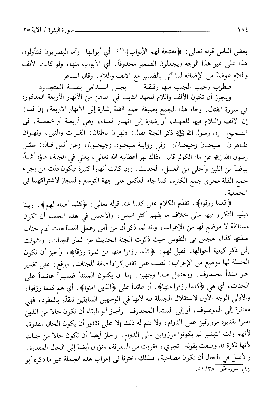 كُلَّما رُزِقُوا، تَقَدَّمَ الْكَلَامُ عَلَى كُلَّمَا عِنْدَ قَوْلِهِ تَعَالَى: كُلَّما أَضاءَ لَهُمْ، وَبَيَّنَّا كَيْفِيَّةَ التَّكْرَارِ فِيهَا عَلَى خِلَافِ مَا يَفْهَمُ أَكْثَرُ النَّاسِ، وَالْأَحْسَنُ فِي هَذِهِ الْجُمْلَةِ أَنَّ تَكُونَ مُسْتَأْنَفَةٌ لَا مَوْضِعَ لَهَا مِنَ الْإِعْرَابِ، وَأَنَّهُ لَمَّا ذَكَرَ أَنَّ مَنْ آمَنَ وَعَمِلَ الصَّالِحَاتِ لَهُمْ جَنَّاتٌ صِفَتُهَا كَذَا، هَجَسَ فِي النُّفُوسِ حَيْثُ ذُكِرَتِ الْجَنَّةُ الْحَدِيثُ عَنْ ثِمَارِ الْجَنَّاتِ، وَتَشَوَّقَتْ إِلَى ذِكْرِ كَيْفِيَّةِ أَحْوَالِهَا، فَقِيلَ لَهُمْ: كُلَّما رُزِقُوا مِنْها مِنْ ثَمَرَةٍ رِزْقاً، وَأُجِيزَ أَنْ تَكُونَ الْجُمْلَةُ لَهَا مَوْضِعٌ مِنَ الْإِعْرَابِ: نَصْبٌ عَلَى تَقْدِيرِ كَوْنِهَا صِفَةً لِلْجَنَّاتِ، وَرَفْعٌ: عَلَى تَقْدِيرِ خَبَرِ مُبْتَدَأٍ مَحْذُوفٍ. وَيَحْتَمِلُ هَذَا وَجْهَيْنِ: إِمَّا أَنْ يَكُونَ الْمُبْتَدَأُ ضَمِيرًا عَائِدًا عَلَى الْجَنَّاتِ، أَيْ هِيَ كُلَّما رُزِقُوا مِنْها، أَوْ عَائِدًا عَلَى الَّذِينَ آمَنُوا، أَيْ هُمْ كُلَّمَا رُزِقُوا، وَالْأَوْلَى الْوَجْهُ الْأَوَّلُ لِاسْتِقْلَالِ الْجُمْلَةِ فِيهِ لِأَنَّهَا فِي الْوَجْهَيْنِ السَّابِقَيْنِ تَتَقَدَّرُ بِالْمُفْرَدِ، فَهِيَ مُفْتَقِرَةٌ إِلَى الْمَوْصُوفِ، أَوْ إِلَى الْمُبْتَدَأِ الْمَحْذُوفِ. وَأَجَازَ أَبُو الْبَقَاءِ أَنْ تكون حالا من الَّذِينَ آمَنُوا تَقْدِيرُهُ مَرْزُوقِينَ عَلَى الدَّوَامِ، وَلَا يَتِمُ لَهُ ذَلِكَ إِلَّا عَلَى تَقْدِيرِ أَنْ يَكُونَ الْحَالُ مَقْدِرَةً، لِأَنَّهُمْ وَقْتَ التَّبْشِيرِ لَمْ يَكُونُوا مَرْزُوقِينَ عَلَى الدَّوَامِ. وَأَجَازَ أَيْضًا أَنْ تَكُونَ حَالًا مِنْ جَنَّاتٍ لِأَنَّهَا نَكِرَةٌ قَدْ وُصِفَتْ بِقَوْلِهِ: تَجْرِي، فَقَرُبَتْ مِنَ الْمَعْرِفَةِ، وَتُؤَوَّلُ أَيْضًا إِلَى الْحَالِ الْمُقَدَّرَةِ.