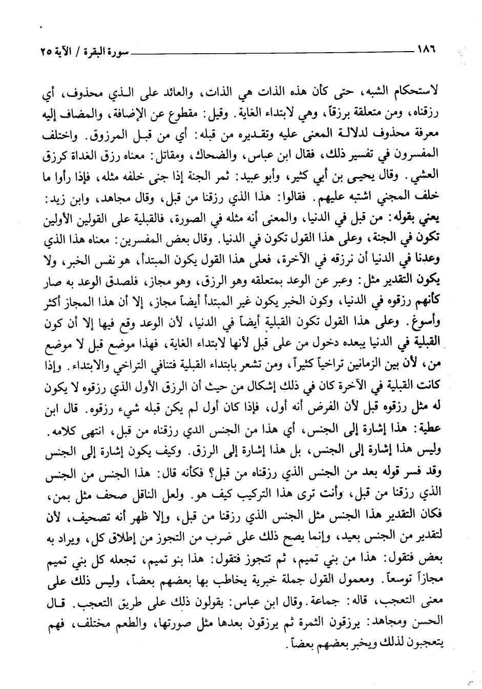 لِاسْتِحْكَامِ الشَّبَهِ، حَتَّى كَأَنَّ هَذِهِ الذَّاتَ هِيَ الذَّاتُ، وَالْعَائِدُ عَلَى الَّذِي مَحْذُوفٌ، أَيْ رُزِقْنَاهُ، وَمِنْ مُتَعَلِّقَةٌ برزقا، وَهِيَ لِابْتِدَاءِ الْغَايَةِ. وَقِيلَ: مَقْطُوعٌ عَنِ الْإِضَافَةِ، وَالْمُضَافُ إِلَيْهِ مَعْرِفَةٌ مَحْذُوفٌ لِدَلَالَةِ الْمَعْنَى عَلَيْهِ وَتَقْدِيرُهُ مِنْ قَبْلِهِ: أَيْ مِنْ قَبْلِ الْمَرْزُوقِ. وَاخْتَلَفَ الْمُفَسِّرُونَ فِي تَفْسِيرِ ذَلِكَ، فَقَالَ ابْنُ عَبَّاسٍ، وَالضَّحَّاكُ، وَمُقَاتِلٌ: مَعْنَاهُ رِزْقُ الْغَدَاةِ كَرِزْقِ الْعَشِيِّ. وَقَالَ يَحْيَى بْنُ أَبِي كَثِيرٍ، وَأَبُو عَبِيدَ: ثَمَرُ الْجَنَّةِ إِذَا جُنِيَ خَلَفَهُ مِثْلُهُ، فَإِذَا رَأَوْا مَا خَلَفَ الْمَجْنِيَّ اشْتَبَهَ عَلَيْهِمْ. فَقَالُوا: هَذَا الَّذِي رُزِقَنَا مِنْ قَبْلُ، وَقَالَ مُجَاهِدٌ، وَابْنُ زَيْدٍ: