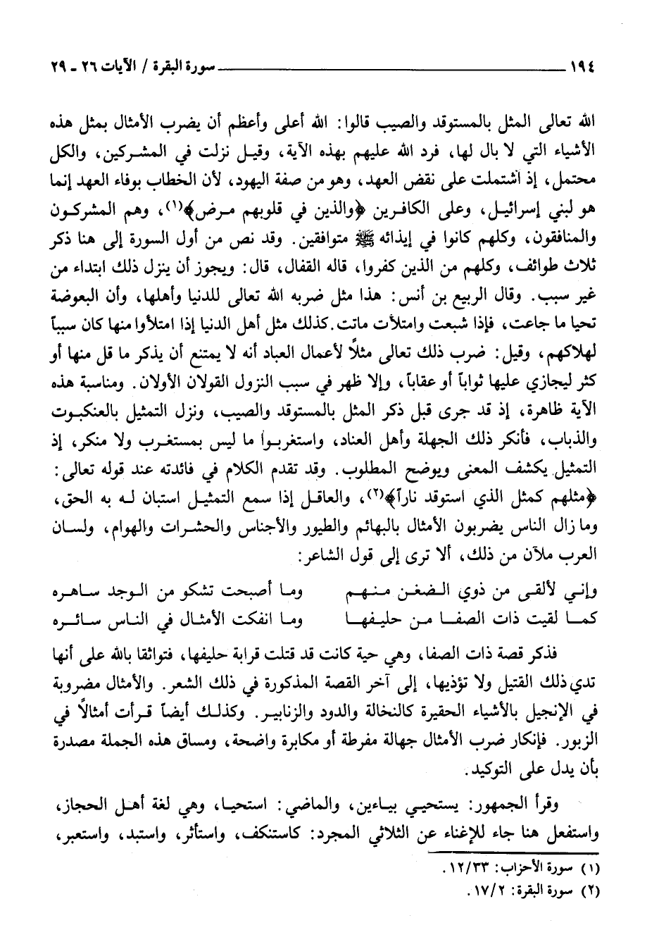 فَذَكَرَ قِصَّةَ ذَاتِ الصَّفَا، وَهِيَ حَيَّةٌ كَانَتْ قَدْ قُتِلَتْ قُرَابَةَ حَلِيفِهَا، فَتَوَاثَقَا بِاللَّهِ على أنها تدي ذَلِكَ الْقَتِيلِ وَلَا تُؤْذِيهَا، إِلَى آخِرِ الْقِصَّةِ الْمَذْكُورَةِ فِي ذَلِكَ الشِّعْرِ. وَالْأَمْثَالُ مَضْرُوبَةٌ فِي الْإِنْجِيلِ بِالْأَشْيَاءِ الْحَقِيرَةِ كَالنُّخَالَةِ وَالدُّودِ وَالزَّنَابِيرِ. وَكَذَلِكَ أَيْضًا قَرَأْتُ أَمْثَالًا فِي الزَّبُورِ. فَإِنْكَارُ ضَرْبِ الْأَمْثَالِ جَهَالَةٌ مُفْرِطَةٌ أَوْ مُكَابَرَةٌ وَاضِحَةٌ، وَمَسَاقُ هَذِهِ الْجُمْلَةِ مُصَدَّرَةٌ بِأَنْ يَدُلَّ عَلَى التَّوْكِيدِ.