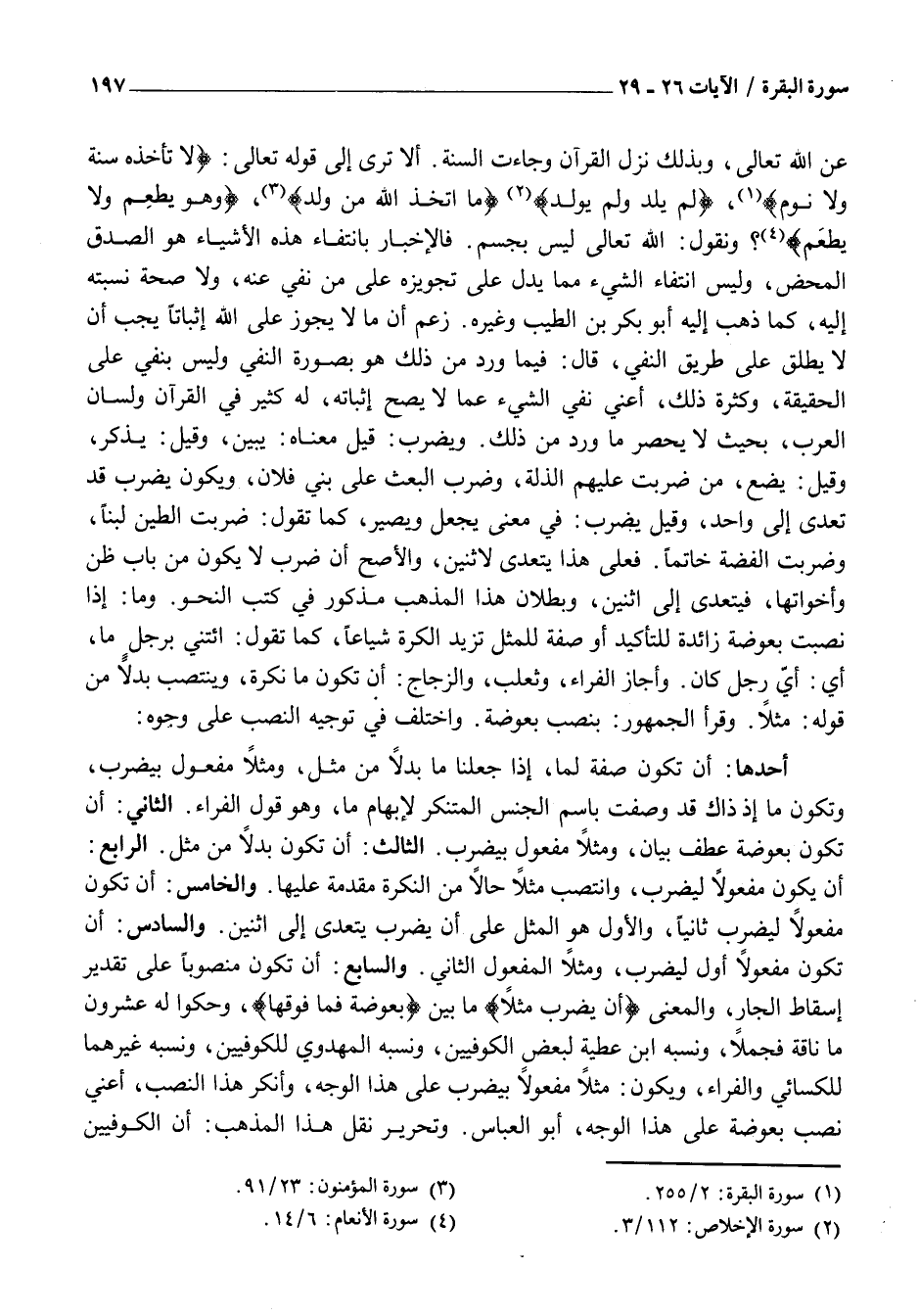 أَنْ يَكُونَ مَفْعُولًا لِيَضْرِبَ، وَانْتَصَبَ مَثَلًا حَالًا مِنَ النَّكِرَةِ مُقَدَّمَةٌ عَلَيْهَا. وَالْخَامِسُ: أَنْ تَكُونَ مَفْعُولًا لِيَضْرِبَ ثَانِيًا، وَالْأَوَّلُ هُوَ الْمَثَلُ عَلَى أَنَّ يَضْرِبَ يَتَعَدَّى إِلَى اثْنَيْنِ. وَالسَّادِسُ: أَنْ تَكُونَ مَفْعُولًا أَوَّلَ لِيَضْرِبَ، وَمَثَلًا الْمَفْعُولُ الثَّانِي. وَالسَّابِعُ: أَنْ تَكُونَ مَنْصُوبًا عَلَى تَقْدِيرِ إِسْقَاطِ الْجَارِّ، وَالْمَعْنَى أَنْ يَضْرِبَ مَثَلًا مَا بَيْنَ بَعُوضَةً فَما فَوْقَها، وَحَكَوْا لَهُ عِشْرُونَ مَا نَاقَةً فَجَمَلًا، وَنَسَبَهُ ابْنُ عَطِيَّةَ لِبَعْضِ الْكُوفِيِّينَ، وَنَسَبَهُ الْمَهْدَوِيُّ لِلْكُوفِيِّينَ، وَنَسَبَهُ غَيْرُهُمَا لِلْكِسَائِيِّ وَالْفَرَّاءِ، وَيَكُونُ: مَثَلًا مَفْعُولًا بِيَضْرِبُ عَلَى هَذَا الْوَجْهِ، وَأَنْكَرَ هَذَا النَّصْبَ، أَعْنِي نَصْبَ بَعُوضَةٍ عَلَى هَذَا الْوَجْهِ، أَبُو الْعَبَّاسِ. وَتَحْرِيرُ نَقْلِ هَذَا المذهب: أن الكوفيين