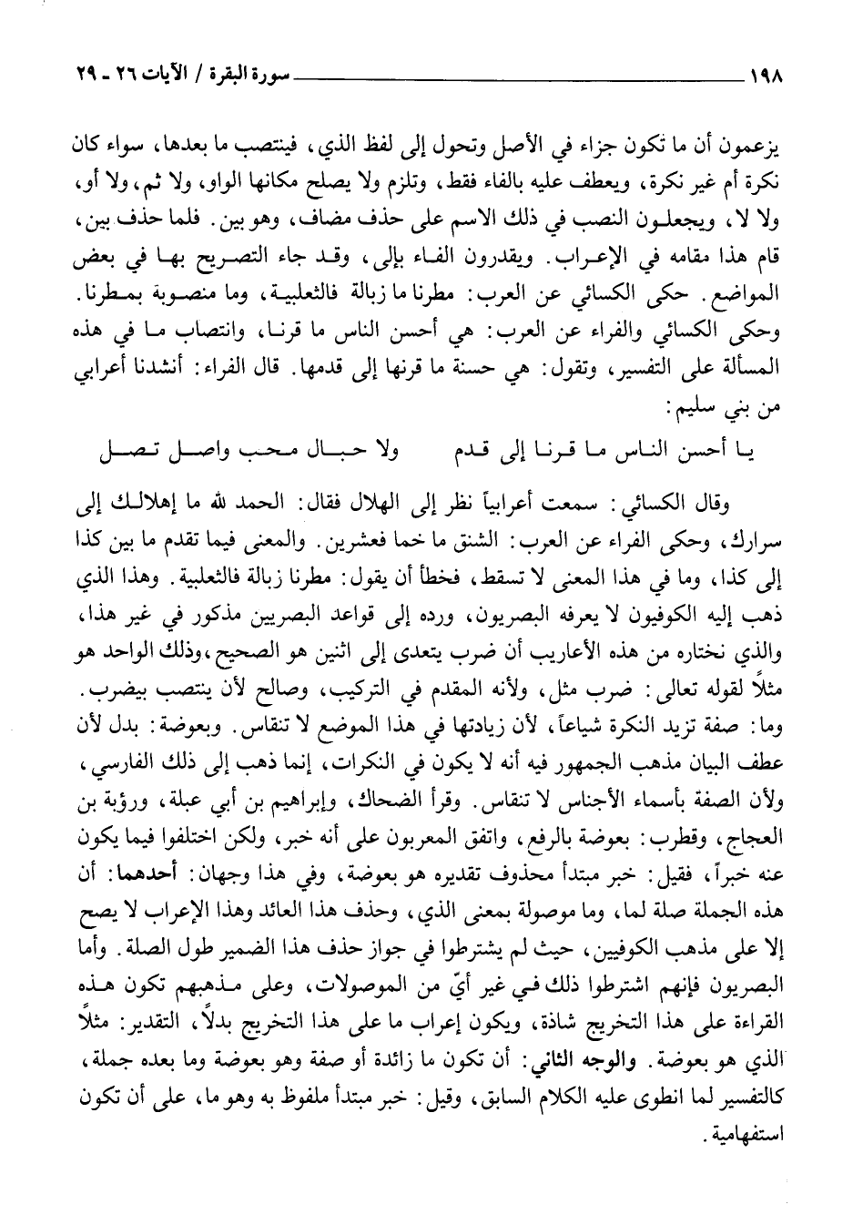 وَقَالَ الْكِسَائِيُّ: سَمِعْتُ أَعْرَابِيًّا نَظَرَ إِلَى الْهِلَالِ فَقَالَ: الْحَمْدُ لِلَّهِ مَا إِهْلَالُكَ إِلَى سِرَارِكَ، وَحَكَى الْفَرَّاءُ عَنِ الْعَرَبِ: الشَّنْقُ مَا خُمَّا فَعِشْرِينَ. وَالْمَعْنَى فِيمَا تَقَدَّمَ مَا بَيْنَ كَذَا إِلَى كَذَا، وَمَا فِي هَذَا الْمَعْنَى لَا تَسْقُطُ، فَخَطَأٌ أَنْ يَقُولَ: مُطِرْنَا زُبَالَةً فَالثَّعْلَبِيَّةُ. وَهَذَا الَّذِي ذَهَبَ إِلَيْهِ الْكُوفِيُّونَ لَا يَعْرِفُهُ الْبَصْرِيُّونَ، وَرَدُّهُ إِلَى قَوَاعِدِ الْبَصْرِيِّينَ مَذْكُورٌ فِي غَيْرِ هَذَا، وَالَّذِي نَخْتَارُهُ مِنْ هَذِهِ الْأَعَارِيبِ أَنَّ ضَرَبَ يَتَعَدَّى إِلَى اثْنَيْنِ هُوَ الصَّحِيحُ، وَذَلِكَ الواحد هُوَ مَثَلًا لِقَوْلِهِ تَعَالَى: ضُرِبَ مَثَلٌ، وَلِأَنَّهُ الْمُقَدَّمُ فِي التَّرْكِيبِ، وَصَالِحٌ لِأَنْ يَنْتَصِبَ بِيَضْرِبَ.
