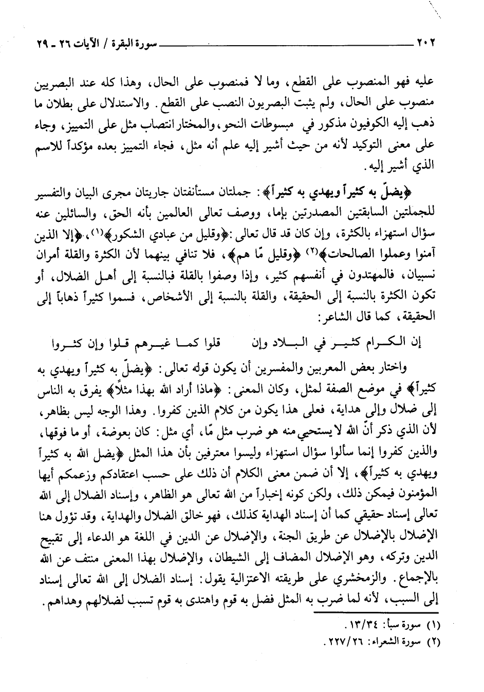 يُضِلُّ بِهِ كَثِيراً وَيَهْدِي بِهِ كَثِيراً: جُمْلَتَانِ مُسْتَأْنَفَتَانِ جَارِيَتَانِ مَجْرَى الْبَيَانِ وَالتَّفْسِيرِ لِلْجُمْلَتَيْنِ السَّابِقَتَيْنِ الْمُصَدَّرَتَيْنِ بِإِمَّا، وَوَصَفَ تَعَالَى الْعَالِمِينَ بِأَنَّهُ الْحَقُّ، وَالسَّائِلِينَ عَنْهُ سُؤَالَ اسْتِهْزَاءٍ بِالْكَثْرَةِ، وَإِنْ كَانَ قَدْ قَالَ تَعَالَى: وَقَلِيلٌ مِنْ عِبادِيَ الشَّكُورُ «1» ، إِلَّا الَّذِينَ آمَنُوا وَعَمِلُوا الصَّالِحاتِ «2» وَقَلِيلٌ مَا هُمْ، فَلَا تَنَافِيَ بَيْنَهُمَا لِأَنَّ الْكَثْرَةَ وَالْقِلَّةَ أَمْرَانِ نِسْبِيَّانِ، فَالْمُهْتَدُونَ فِي أَنْفُسِهِمْ كَثِيرٌ، وَإِذَا وُصِفُوا بِالْقِلَّةِ فَبِالنِّسْبَةِ إِلَى أَهْلِ الضَّلَالِ، أَوْ تَكُونُ الْكَثْرَةُ بِالنِّسْبَةِ إِلَى الْحَقِيقَةِ، وَالْقِلَّةُ بِالنِّسْبَةِ إِلَى الْأَشْخَاصِ، فَسُمُّوا كَثِيرًا ذَهَابًا إِلَى الْحَقِيقَةِ، كَمَا قَالَ الشَّاعِرُ: