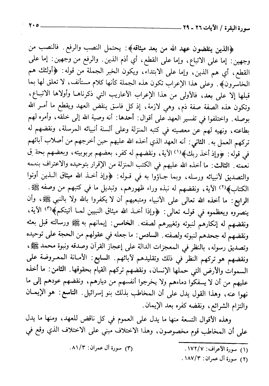 الَّذِينَ يَنْقُضُونَ عَهْدَ اللَّهِ مِنْ بَعْدِ مِيثاقِهِ: يَحْتَمِلُ النَّصْبَ وَالرَّفْعَ. فَالنَّصْبُ مِنْ وَجْهَيْنِ: إِمَّا عَلَى الِاتِّبَاعِ، وَإِمَّا عَلَى الْقَطْعِ، أَيْ أَذُمُّ الَّذِينَ. وَالرَّفْعُ مِنْ وَجْهَيْنِ: إِمَّا عَلَى الْقَطْعِ، أَيْ هُمُ الَّذِينَ، وَإِمَّا عَلَى الِابْتِدَاءِ، وَيَكُونُ الْخَبَرُ الْجُمْلَةُ مِنْ قَوْلِهِ: أُولئِكَ هُمُ الْخاسِرُونَ. وَعَلَى هَذَا الْإِعْرَابِ تَكُونُ هَذِهِ الْجُمْلَةُ كَأَنَّهَا كَلَامٌ مُسْتَأْنَفٌ، لَا تَعَلُّقَ لَهَا بِمَا قَبْلَهَا إِلَّا عَلَى بُعْدٍ، فَالْأَوْلَى مِنْ هَذَا الْإِعْرَابِ الْأَعَارِيبُ الَّتِي ذَكَرْنَاهَا وَأَوْلَاهَا الْإِتْبَاعُ، وَتَكُونُ هَذِهِ الصِّفَةُ صِفَةَ ذَمٍّ، وَهِيَ لَازِمَةٌ، إِذْ كُلُّ فَاسِقٍ يَنْقُضُ الْعَهْدَ وَيَقْطَعُ مَا أَمَرَ اللَّهُ بِوَصْلِهِ. وَاخْتَلَفُوا فِي تَفْسِيرِ الْعَهْدِ عَلَى أَقْوَالٍ: أَحَدُهَا: أَنَّهُ وَصِيَّةُ اللَّهِ إِلَى خَلْقِهِ، وَأَمْرُهُ لَهُمْ بِطَاعَتِهِ، وَنَهْيُهُ لَهُمْ عَنْ مَعْصِيَتِهِ فِي كُتُبِهِ الْمُنَزَّلَةِ وَعَلَى أَلْسِنَةِ أَنْبِيَائِهِ الْمُرْسَلَةِ، وَنَقْضُهُمْ لَهُ تَرْكُهُمُ الْعَمَلَ بِهِ. الثَّانِي: أَنَّهُ الْعَهْدُ الَّذِي أَخَذَهُ اللَّهُ عَلَيْهِمْ حِينَ أَخْرَجَهُمْ مِنْ أَصْلَابِ آبَائِهِمْ فِي قَوْلِهِ: وَإِذْ أَخَذَ رَبُّكَ «1» الْآيَةَ، وَنَقْضُهُمْ لَهُ كُفْرُ، بَعْضِهِمْ بِرُبُوبِيَّتِهِ، وَبَعْضِهِمْ بِحُقُوقِ نِعْمَتِهِ. الثَّالِثُ: مَا أَخَذَهُ اللَّهُ عَلَيْهِمْ فِي الْكُتُبِ الْمُنَزَّلَةِ مِنَ الْإِقْرَارِ بِتَوْحِيدِهِ وَالِاعْتِرَافِ بِنِعَمِهِ وَالتَّصْدِيقِ لأنبيائه ورسله، وبما جاؤوا بِهِ فِي قَوْلِهِ: وَإِذْ أَخَذَ اللَّهُ مِيثاقَ الَّذِينَ أُوتُوا الْكِتابَ «2» الْآيَةَ، وَنَقْضُهُمْ لَهُ نَبْذُهُ وَرَاءَ ظُهُورِهِمْ، وَتَبْدِيلُ مَا فِي كُتُبِهِمْ مِنْ وَصْفِهِ صَلَّى اللَّهُ عَلَيْهِ وَسَلَّمَ.