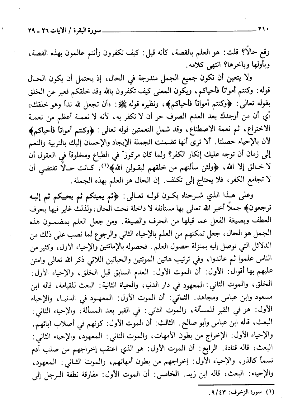 وَعَلَى هَذَا الَّذِي شَرَحْنَاهُ يَكُونُ قَوْلُهُ تَعَالَى: ثُمَّ يُمِيتُكُمْ ثُمَّ يُحْيِيكُمْ ثُمَّ إِلَيْهِ تُرْجَعُونَ جُمَلًا أَخْبَرَ اللَّهُ تَعَالَى بِهَا مُسْتَأْنَفَةً لَا دَاخِلَةً تَحْتَ الْحَالِ، وَلِذَلِكَ غَايَرَ فِيهَا بِحَرْفِ الْعَطْفِ وَبِصِيغَةِ الْفِعْلِ عَمَّا قَبْلَهَا مِنَ الْحَرْفِ وَالصِّيغَةِ. وَمَنْ جَعَلَ الْعِلْمَ بِمَضْمُونِ هَذِهِ الْجُمَلِ هُوَ الْحَالَ، جَعَلَ تَمَكُّنَهُمْ مِنَ الْعِلْمِ بِالْإِحْيَاءِ الثَّانِي وَالرُّجُوعِ لِمَا نُصِبَ عَلَى ذَلِكَ مِنَ الدَّلَائِلِ الَّتِي تُوَصِّلُ إِلَيْهِ بِمَنْزِلَةِ حُصُولِ الْعِلْمِ. فَحُصُولُهُ بِالْإِمَاتَتَيْنِ وَالْإِحْيَاءِ الْأَوَّلِ، وَكَثِيرٌ مِنَ النَّاسِ عَلِمُوا ثُمَّ عَانَدُوا، وَفِي تَرْتِيبِ هَاتَيْنِ الْمَوْتَتَيْنِ وَالْحَيَاتَيْنِ اللَّاتِي ذَكَرَ اللَّهُ تَعَالَى وَامْتَنَّ عَلَيْهِمْ بِهَا أَقْوَالٌ: الْأَوَّلُ: أَنَّ الْمَوْتَ الْأَوَّلَ: الْعَدَمُ السَّابِقُ قَبْلَ الْخَلْقِ، وَالْإِحْيَاءَ الْأَوَّلَ: