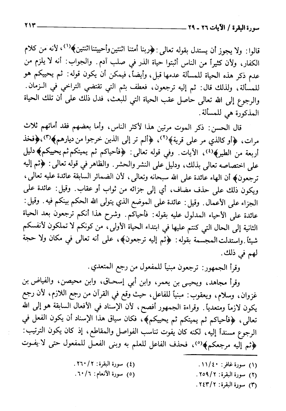 «4» ، الْآيَاتِ. وَفِي قَوْلِهِ تَعَالَى: فَأَحْياكُمْ ثُمَّ يُمِيتُكُمْ ثُمَّ يُحْيِيكُمْ دَلِيلٌ عَلَى اخْتِصَاصِهِ تَعَالَى بِذَلِكَ، وَدَلِيلٌ عَلَى النَّشْرِ وَالْحَشْرِ. وَالظَّاهِرُ فِي قَوْلِهِ تَعَالَى: ثُمَّ إِلَيْهِ تُرْجَعُونَ أَنَّ الْهَاءَ عَائِدَةٌ عَلَى اللَّهِ سُبْحَانَهُ وَتَعَالَى، لِأَنَّ الضَّمَائِرَ السَّابِقَةَ عَائِدَةٌ عَلَيْهِ تَعَالَى، وَيَكُونُ ذَلِكَ عَلَى حَذْفِ مُضَافٍ، أَيْ إِلَى جَزَائِهِ مِنْ ثَوَابٍ أَوْ عِقَابٍ. وَقِيلَ: عَائِدَةٌ عَلَى الْجَزَاءِ عَلَى الْأَعْمَالِ. وَقِيلَ: عَائِدَةٌ عَلَى الْمَوْضِعِ الَّذِي يَتَوَلَّى اللَّهُ الْحُكْمَ بَيْنَكُمْ فِيهِ. وَقِيلَ:
