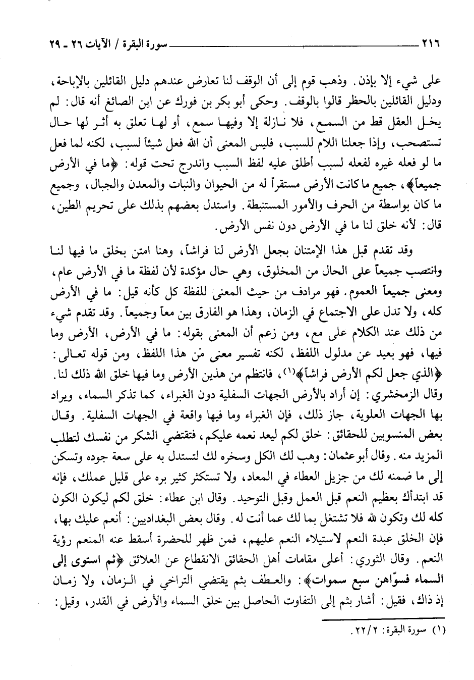 عَلَى شَيْءٍ إِلَّا بِإِذْنٍ. وَذَهَبَ قَوْمٌ إِلَى أَنَّ الوقف لنا تَعَارَضَ عِنْدَهُمْ دَلِيلُ الْقَائِلِينَ بِالْإِبَاحَةِ، وَدَلِيلُ الْقَائِلِينَ بِالْحَظْرِ قَالُوا بِالْوَقْفِ. وَحَكَى أَبُو بَكْرِ بْنُ فَوْرَكٍ عَنِ ابْنِ الصَّائِغِ أَنَّهُ قَالَ: لَمْ يَخْلُ الْعَقْلُ قَطُّ مِنَ السَّمْعِ، فَلَا نَازِلَةٌ إِلَّا وَفِيهَا سَمْعٌ، أَوْ لَهَا تَعَلُّقٌ بِهِ أَثَرٌ لَهَا حَالٌ تُسْتَصْحَبُ، وَإِذَا جَعَلْنَا اللَّامَ لِلسَّبَبِ، فَلَيْسَ الْمَعْنَى أَنَّ اللَّهَ فَعَلَ شَيْئًا لِسَبَبٍ، لَكِنَّهُ لَمَّا فَعَلَ مَا لَوْ فَعَلَهُ غَيْرُهُ لَفَعَلَهُ لَسَبَبٍ أُطْلِقَ عَلَيْهِ لَفْظُ السَّبَبِ وَانْدَرَجَ تَحْتَ قَوْلِهِ: مَا فِي الْأَرْضِ جَمِيعاً، جَمِيعُ مَا كَانَتِ الْأَرْضُ مُسْتَقَرًّا لَهُ مِنَ الْحَيَوَانِ وَالنَّبَاتِ وَالْمَعْدِنِ وَالْجِبَالِ، وَجَمِيعُ مَا كَانَ بِوَاسِطَةٍ مِنَ الْحِرَفِ وَالْأُمُورِ الْمُسْتَنْبَطَةِ. وَاسْتَدَلَّ بَعْضُهُمْ بِذَلِكَ عَلَى تَحْرِيمِ الطِّينِ، قَالَ: لِأَنَّهُ خَلَقَ لَنَا مَا فِي الْأَرْضِ دُونَ نَفْسِ الْأَرْضِ.