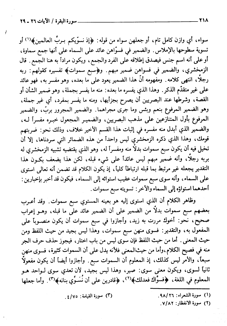 سَوَاءٌ، أَيْ وَازِنٌ كَامِلٌ تَامٌّ، أَوْ جَعْلُهُنَّ سَوَاءً مِنْ قَوْلِهِ: إِذْ نُسَوِّيكُمْ بِرَبِّ الْعالَمِينَ «1» أَوْ تَسْوِيَةُ سُطُوحِهَا بِالْإِمْلَاسِ. وَالضَّمِيرُ فِي فَسَوَّاهُنَّ عَائِدٌ عَلَى السَّمَاءِ عَلَى أَنَّهَا جَمْعُ سَمَاوَةٍ، أَوْ عَلَى أَنَّهُ اسْمُ جِنْسٍ فَيَصْدُقُ إِطْلَاقُهُ عَلَى الْفَرْدِ وَالْجَمْعِ، وَيَكُونُ مُرَادًا بِهِ هُنَا الْجَمْعُ. قَالَ الزَّمَخْشَرِيُّ، وَالضَّمِيرُ فِي فَسَوَّاهُنَّ ضمير مبهم. وسَبْعَ سَماواتٍ تَفْسِيرُهُ كَقَوْلِهِمْ: رُبَّهُ رَجُلًا، انْتَهَى كَلَامُهُ. وَمَفْهُومُهُ أَنَّ هَذَا الضَّمِيرَ يَعُودُ عَلَى مَا بَعْدَهُ، وَهُوَ مُفَسَّرٌ بِهِ، فَهُوَ عَائِدٌ عَلَى غَيْرِ مُتَقَدِّمِ الذِّكْرِ. وَهَذَا الَّذِي يُفَسِّرُهُ مَا بَعْدَهُ: مِنْهُ مَا يُفَسَّرُ بِجُمْلَةٍ، وَهُوَ ضَمِيرُ الشَّأْنِ أَوِ الْقِصَّةِ، وَشَرْطُهَا عِنْدَ الْبَصْرِيِّينَ أَنْ يُصَرَّحَ بِجُزْأَيْهَا، وَمِنْهُ مَا يُفَسَّرُ بِمُفْرِدٍ، أَيْ غَيْرِ جُمْلَةٍ، وَهُوَ الضَّمِيرُ الْمَرْفُوعُ بِنِعْمَ وَبِئْسَ وَمَا جَرَى مَجْرَاهُمَا. وَالضَّمِيرُ الْمَجْرُورُ بِرُبَّ، وَالضَّمِيرُ الْمَرْفُوعُ بِأَوَّلِ الْمُتَنَازِعَيْنِ عَلَى مَذْهَبِ الْبَصْرِيِّينَ، وَالضَّمِيرُ الْمَجْعُولُ خَبَرُهُ مُفَسِّرًا لَهُ، وَالضَّمِيرُ الَّذِي أبدل منه مفسره في إِثْبَاتِ هَذَا الْقِسْمِ الْأَخِيرِ خِلَافٌ، وَذَلِكَ نَحْوَ: ضَرَبْتُهُمْ قَوْمُكَ، وَهَذَا الَّذِي ذَكَرَهُ الزَّمَخْشَرِيُّ لَيْسَ وَاحِدًا مِنْ هَذِهِ الضَّمَائِرِ الَّتِي سَرَدْنَاهَا، إِلَّا أَنْ تَخَيَّلَ فِيهِ أن يكون سبع سموات بَدَلًا مِنْهُ وَمُفَسِّرًا لَهُ، وَهُوَ الَّذِي يَقْتَضِيهِ تَشْبِيهُ الزَّمَخْشَرِيِّ لَهُ بِرُبَّهُ رَجُلًا، وَأَنَّهُ ضَمِيرٌ مُبْهَمٌ لَيْسَ عَائِدًا عَلَى شَيْءٍ قَبْلَهُ، لَكِنَّ هَذَا يُضَعَّفُ بِكَوْنِ هَذَا التَّقْدِيرِ يَجْعَلُهُ غَيْرَ مُرْتَبِطٍ بِمَا قَبْلَهُ ارْتِبَاطًا كُلِّيًّا، إِذْ يَكُونُ الْكَلَامُ قَدْ تَضَمَّنُ أَنَّهُ تَعَالَى اسْتَوَى عَلَى السَّمَاءِ، وَأَنَّهُ سوى سبع سموات عَقِيبَ اسْتِوَائِهِ إِلَى السَّمَاءِ، فَيَكُونُ قَدْ أَخْبَرَ بِإِخْبَارَيْنِ: