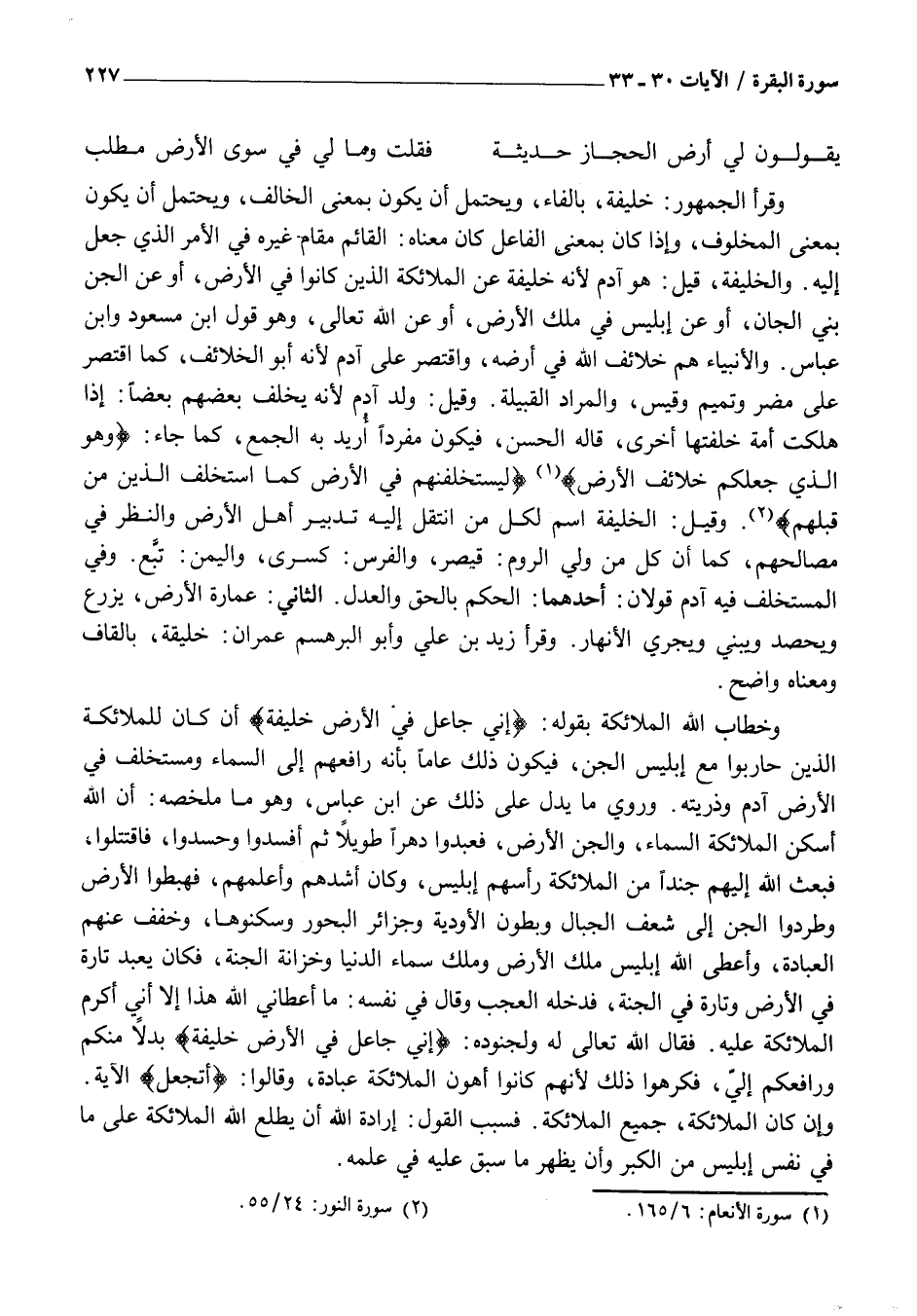 وَخِطَابُ اللَّهِ الْمَلَائِكَةَ بِقَوْلِهِ: إِنِّي جاعِلٌ فِي الْأَرْضِ خَلِيفَةً إِنْ كَانَ لِلْمَلَائِكَةِ الَّذِينَ حَارَبُوا مَعَ إِبْلِيسَ الْجِنَّ، فَيَكُونُ ذَلِكَ عَامَّا بِأَنَّهُ رَافِعُهُمْ إِلَى السَّمَاءِ وَمُسْتَخْلَفٌ فِي الْأَرْضِ آدَمَ وَذُرِّيَّتَهُ. وَرُوِيَ مَا يَدُلُّ عَلَى ذَلِكَ عَنِ ابْنِ عَبَّاسٍ، وَهُوَ مَا مُلَخَّصُهُ: أَنَّ اللَّهَ أَسْكَنَ الْمَلَائِكَةَ السَّمَاءَ، وَالْجِنَّ الْأَرْضَ، فَعَبَدُوا دَهْرًا طَوِيلًا ثُمَّ أَفْسَدُوا وَحَسَدُوا، فَاقْتَتَلُوا، فَبَعَثَ اللَّهُ إِلَيْهِمْ جُنْدًا مِنَ الْمَلَائِكَةِ رَأَسَهُمْ إِبْلِيسُ، وَكَانَ أَشَدَّهُمْ وَأَعْلَمَهُمْ، فَهَبَطُوا الْأَرْضَ وَطَرَدُوا الْجِنَّ إِلَى شَعَفِ الْجِبَالِ وَبُطُونِ الْأَوْدِيَةِ وَجَزَائِرِ الْبُحُورِ وَسَكَنُوهَا، وَخَفَّفَ عَنْهُمُ الْعِبَادَةَ، وَأَعْطَى اللَّهُ إِبْلِيسَ مُلْكَ الْأَرْضِ وَمُلْكَ سَمَاءِ الدُّنْيَا وَخِزَانَةَ الْجَنَّةِ، فَكَانَ يَعْبُدُ تَارَةً فِي الْأَرْضِ وَتَارَةً فِي الْجَنَّةِ، فَدَخَلَهُ الْعُجْبُ وَقَالَ فِي نَفْسِهِ: مَا أَعْطَانِي اللَّهُ هَذَا إِلَّا أَنِّي أَكْرَمُ الْمَلَائِكَةِ عَلَيْهِ. فَقَالَ اللَّهُ تَعَالَى لَهُ وَلِجُنُودِهِ: إِنِّي جاعِلٌ فِي الْأَرْضِ خَلِيفَةً بَدَلًا مِنْكُمْ وَرَافِعُكُمْ إِلَيَّ، فَكَرِهُوا ذَلِكَ لِأَنَّهُمْ كَانُوا أَهْوَنَ الْمَلَائِكَةِ عِبَادَةً، وَقَالُوا: أَتَجْعَلُ الْآيَةَ.