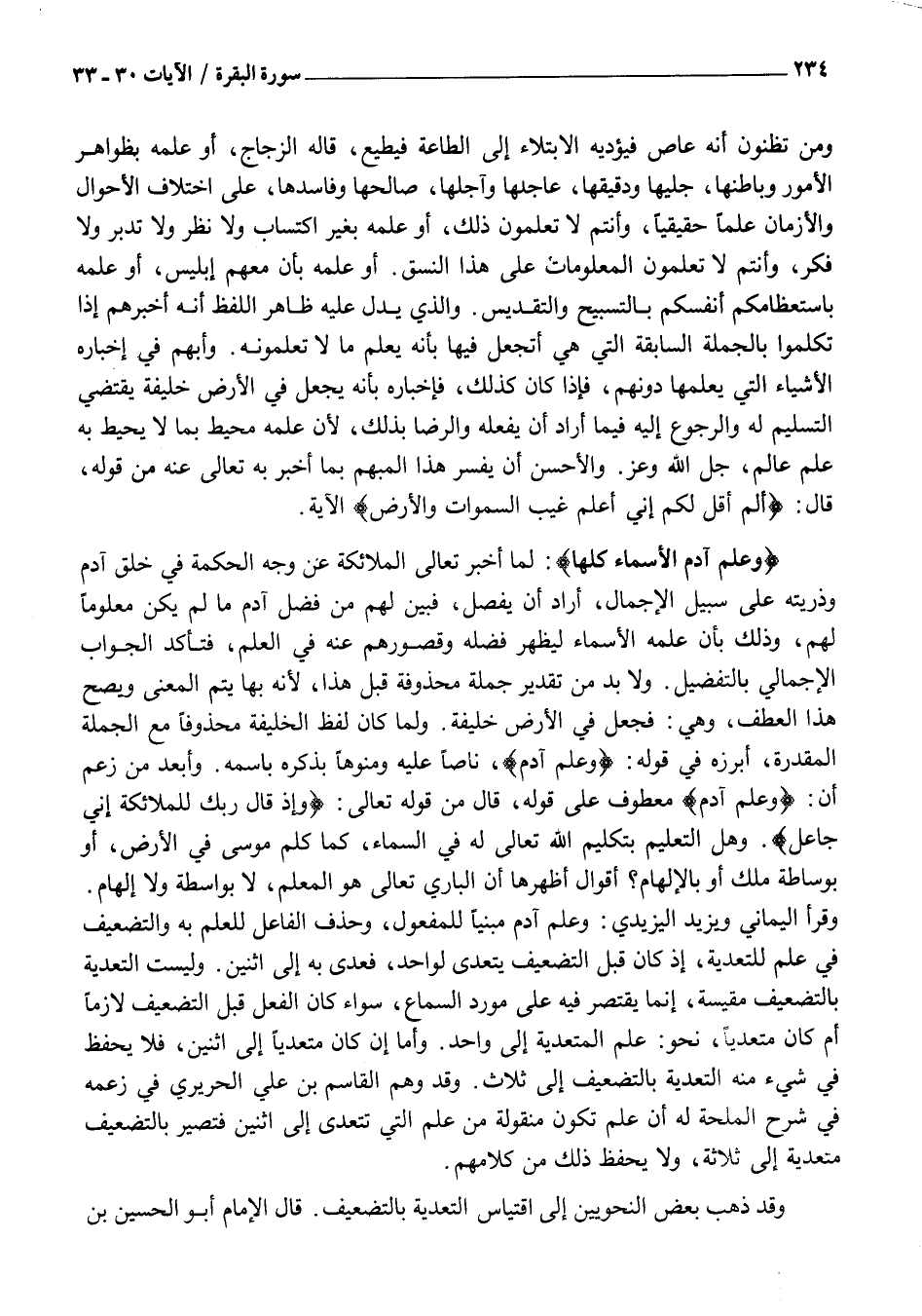 وَعَلَّمَ آدَمَ الْأَسْماءَ كُلَّها: لَمَّا أَخْبَرَ تَعَالَى الْمَلَائِكَةَ عَنْ وَجْهِ الْحِكْمَةِ فِي خَلْقِ آدَمَ وَذُرِّيَّتِهِ عَلَى سَبِيلِ الْإِجْمَالِ، أَرَادَ أَنْ يَفْصِلَ، فَبَيَّنَ لَهُمْ مِنْ فَضْلِ آدَمَ مَا لَمْ يَكُنْ مَعْلُومًا لَهُمْ، وَذَلِكَ بِأَنْ عَلَّمَهُ الْأَسْمَاءَ لِيُظْهِرَ فَضْلَهُ وَقُصُورَهُمْ عَنْهُ فِي الْعِلْمِ، فَتَأَكَّدَ الْجَوَابُ الْإِجْمَالِيُّ بِالتَّفْضِيلِ. وَلَا بُدَّ مِنْ تَقْدِيرِ جُمْلَةٍ مَحْذُوفَةٍ قَبْلَ هَذَا، لِأَنَّهُ بِهَا يَتِمُّ الْمَعْنَى وَيَصِحُّ هَذَا الْعَطْفُ، وَهِيَ: فَجَعَلَ فِي الْأَرْضِ خَلِيفَةً. وَلَمَّا كَانَ لَفْظُ الْخَلِيفَةِ مَحْذُوفًا مَعَ الْجُمْلَةِ الْمُقَدَّرَةِ، أَبْرَزَهُ فِي قَوْلِهِ: وَعَلَّمَ آدَمَ، نَاصًّا عَلَيْهِ وَمُنَوِّهًا بِذِكْرِهِ بِاسْمِهِ. وَأَبْعَدَ مَنْ زَعَمَ أَنَّ: وَعَلَّمَ آدَمَ مَعْطُوفٌ عَلَى قَوْلِهِ، قَالَ مِنْ قَوْلِهِ تَعَالَى: وَإِذْ قالَ رَبُّكَ لِلْمَلائِكَةِ إِنِّي جاعِلٌ. وَهَلِ التَّعْلِيمُ بِتَكْلِيمِ اللَّهِ تَعَالَى لَهُ فِي السَّمَاءِ، كَمَا كَلَّمَ مُوسَى فِي الْأَرْضِ، أَوْ بِوَسَاطَةِ مَلَكٍ أَوْ بِالْإِلْهَامِ؟ أَقْوَالٌ أُظْهَرُهَا أَنَّ الْبَارِي تَعَالَى هُوَ الْمُعَلِّمُ، لَا بِوَاسِطَةٍ وَلَا إِلْهَامٍ.