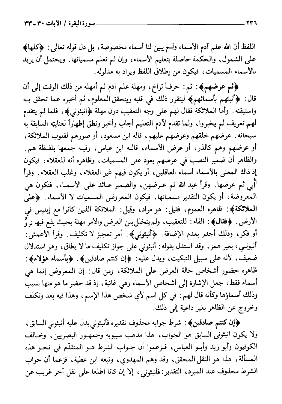 وَالظَّاهِرُ أَنَّ ضَمِيرَ النَّصْبِ فِي عِرَضَهُمْ يَعُودُ عَلَى الْمُسَمَّيَاتِ، وَظَاهِرُهُ أَنَّهُ لِلْعُقَلَاءِ، فَيَكُونُ إِذْ ذَاكَ الْمَعْنِيُ بِالْأَسْمَاءِ أَسْمَاءُ الْعَاقِلِينَ، أَوْ يَكُونَ فِيهِمْ غَيْرَ الْعُقَلَاءِ، وَغَلَّبَ الْعُقَلَاءَ. وَقَرَأَ أُبَيُّ ثُمَّ عَرَضَهَا. وَقَرَأَ عَبْدُ اللَّهِ ثُمَّ عَرَضَهُنَّ، وَالضَّمِيرُ عَائِدٌ عَلَى الْأَسْمَاءِ، فَتَكُونُ هِيَ الْمَعْرُوضَةَ، أَوْ يَكُونَ التَّقْدِيرُ مُسَمَّيَاتِهَا، فَيَكُونُ الْمَعْرُوضُ الْمُسَمَّيَاتُ لَا الْأَسْمَاءُ. عَلَى الْمَلائِكَةِ: ظَاهَرُهُ الْعُمُومُ، فَقِيلَ: هُوَ مُرَادٌ، وَقِيلَ: الْمَلَائِكَةُ الَّذِينَ كَانُوا مَعَ إِبْلِيسَ فِي الْأَرْضِ. فَقالَ: الْفَاءُ: لِلتَّعْقِيبِ، وَلَمْ يَتَخَلَّلْ بَيْنَ الْعَرْضِ وَالْأَمْرِ مُهْلَةٌ بِحَيْثُ يَقَعُ فِيهَا تَرَوٍّ أَوْ فِكْرٍ، وَذَلِكَ أَجْدَرُ بِعَدَمِ الْإِضَافَةِ. أَنْبِئُونِي: أَمْرُ تَعْجِيزٍ لَا تَكْلِيفٍ. وَقَرَأَ الْأَعْمَشُ: