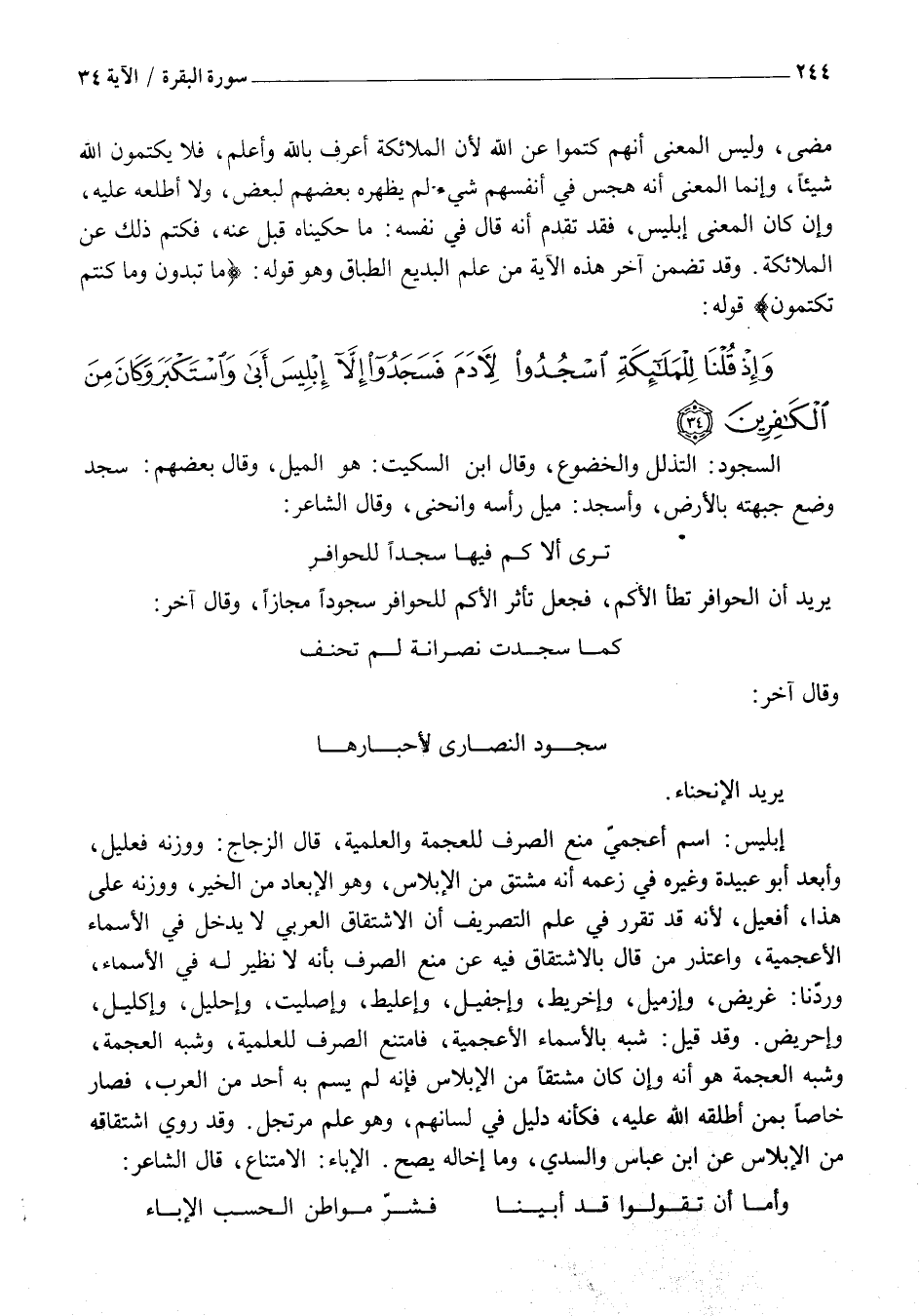 إِبْلِيسُ: اسْمٌ أَعْجَمِيٌّ مُنِعَ الصَّرْفَ لِلْعُجْمَةِ وَالْعَلَمِيَّةِ، قَالَ الزَّجَّاجُ: وَوَزْنُهُ فِعْلِيلُ، وَأَبْعَدَ أَبُو عُبَيْدَةَ وَغَيْرُهُ فِي زَعْمِهِ أَنَّهُ مُشْتَقٌّ مِنَ الْإِبْلَاسِ، وَهُوَ الْإِبْعَادُ مِنَ الْخَيْرِ، وَوَزْنُهُ عَلَى هَذَا، إِفْعِيلٌ، لِأَنَّهُ قَدْ تَقَرَّرَ فِي عِلْمِ التَّصْرِيفِ أَنَّ الِاشْتِقَاقَ الْعَرَبِيَّ لَا يَدْخُلُ فِي الْأَسْمَاءِ الْأَعْجَمِيَّةِ، وَاعْتَذَرَ مَنْ قَالَ بِالِاشْتِقَاقِ فِيهِ عَنْ مَنْعِ الصَّرْفِ بِأَنَّهُ لَا نَظِيرَ لَهُ فِي الأسماء، وردّنا: غريض، وَإِزْمِيلٍ، وَإِخْرِيطٍ، وَإِجْفِيلٍ، وَإِعْلِيطٍ، وَإِصْلِيتٍ، وَإِحْلِيلٍ، وَإِكْلِيلٍ، وَإِحْرِيضٍ. وَقَدْ قِيلَ: شُبِّهَ بِالْأَسْمَاءِ الْأَعْجَمِيَّةِ، فَامْتَنَعَ الصَّرْفُ لِلْعَلَمِيَّةِ، وَشِبْهِ الْعُجْمَةِ، وَشِبْهُ الْعُجْمَةِ هُوَ أَنَّهُ وَإِنْ كَانَ مُشْتَقًّا مِنَ الْإِبْلَاسِ فَإِنَّهُ لَمْ يُسَمَّ بِهِ أَحَدٌ مِنَ الْعَرَبِ، فَصَارَ خَاصًّا بِمَنْ أَطْلَقَهُ اللَّهُ عَلَيْهِ، فَكَأَنَّهُ دَلِيلٌ فِي لِسَانِهِمْ، وَهُوَ عَلَمٌ مُرْتَجَلٌ. وَقَدْ رُوِيَ اشْتِقَاقُهُ مِنَ الْإِبْلَاسِ عَنِ ابْنِ عَبَّاسٍ وَالسُّدِّيِّ، وَمَا إِخَالُهُ يَصِحُّ. الْإِبَاءُ: الِامْتِنَاعُ، قَالَ الشَّاعِرُ: