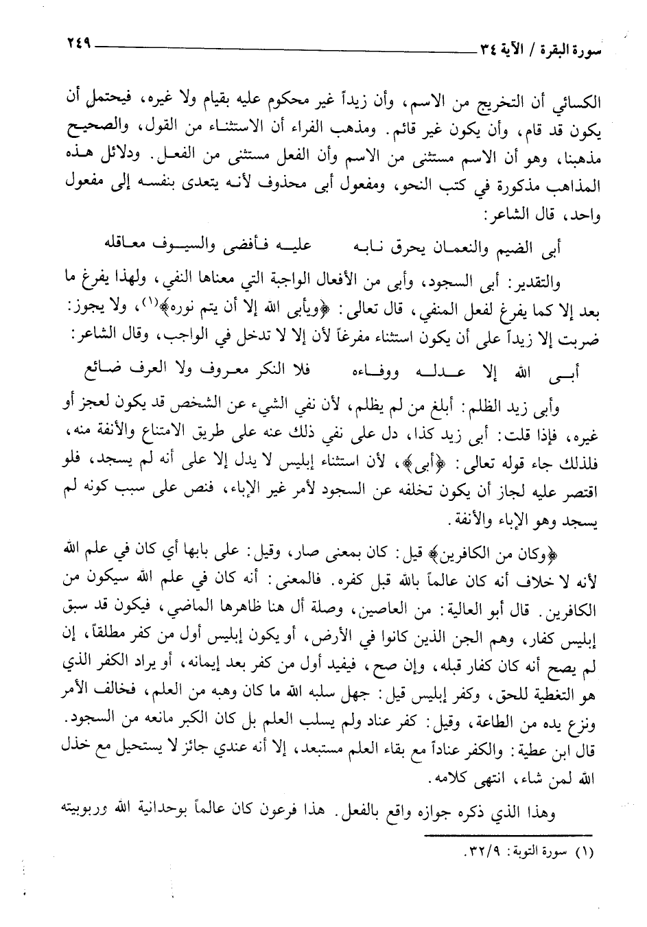 الْكِسَائِيُّ أَنَّ التَّخْرِيجَ مِنَ الِاسْمِ، وَأَنَّ زَيْدًا غَيْرُ مَحْكُومٍ عَلَيْهِ بِقِيَامٍ وَلَا غَيْرِهِ، فَيُحْتَمَلُ أَنْ يَكُونَ قَدْ قَامَ، وَأَنْ يَكُونَ غَيْرَ قَائِمٍ. وَمَذْهَبُ الْفَرَّاءِ أَنَّ الِاسْتِثْنَاءَ مِنَ الْقَوْلِ، وَالصَّحِيحُ مَذْهَبُنَا، وَهُوَ أَنَّ الِاسْمَ مُسْتَثْنًى مِنَ الِاسْمِ وَأَنَّ الْفِعْلَ مُسْتَثْنًى مِنَ الْفِعْلِ. وَدَلَائِلُ هَذِهِ الْمَذَاهِبِ مَذْكُورَةٌ فِي كُتُبِ النَّحْوِ، وَمَفْعُولُ أَبَى مَحْذُوفٌ لِأَنَّهُ يَتَعَدَّى بِنَفْسِهِ إِلَى مَفْعُولٍ وَاحِدٍ، قَالَ الشَّاعِرُ: