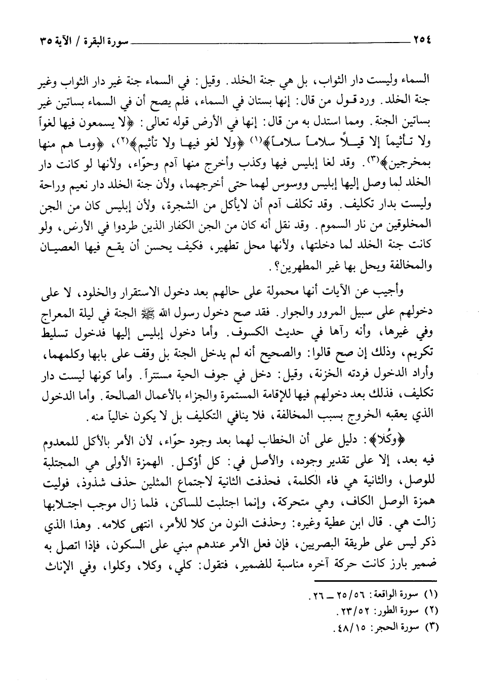 وَأُجِيبَ عَنِ الْآيَاتِ أَنَّهَا مَحْمُولَةٌ عَلَى حَالِهِمْ بَعْدَ دُخُولِ الِاسْتِقْرَارِ وَالْخُلُودِ، لَا عَلَى دُخُولِهِمْ على سبيل المرور والجوار. فَقَدْ صَحَّ دُخُولُ رَسُولِ اللَّهِ صَلَّى اللَّهُ عَلَيْهِ وَسَلَّمَ الْجَنَّةَ فِي لَيْلَةِ الْمِعْرَاجِ وَفِي غَيْرِهَا، وَأَنَّهُ رَآهَا فِي حَدِيثِ الْكُسُوفِ. وَأَمَّا دُخُولُ إِبْلِيسَ إِلَيْهَا فدخول تسليط تَكْرِيمٍ، وَذَلِكَ إِنْ صَحَّ قَالُوا: وَالصَّحِيحُ أَنَّهُ لَمْ يَدْخُلِ الْجَنَّةَ بَلْ وَقَفَ عَلَى بَابِهَا وَكَلَّمَهُمَا، وَأَرَادَ الدُّخُولَ فَرَدَّتْهُ الْخَزَنَةُ، وَقِيلَ: دَخَلَ فِي جَوْفِ الْحَيَّةِ مُسْتَتِرًا. وَأَمَّا كَوْنُهَا لَيْسَتْ دَارَ تَكْلِيفٍ، فَذَلِكَ بَعْدَ دُخُولِهِمْ فِيهَا لِلْإِقَامَةِ الْمُسْتَمِرَّةِ وَالْجَزَاءِ بِالْأَعْمَالِ الصَّالِحَةِ. وَأَمَّا الدُّخُولُ الَّذِي يَعْقُبُهُ الْخُرُوجُ بِسَبَبِ الْمُخَالَفَةِ، فَلَا يُنَافِي التَّكْلِيفَ بَلْ لَا يَكُونُ خَالِيًا مِنْهُ.