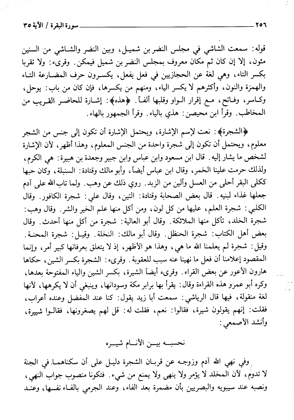 وَقِيلَ: شَجَرَةٌ لَمْ يُعْلِمْنَا اللَّهُ مَا هِيَ، وَهَذَا هُوَ الْأَظْهَرُ، إِذْ لَا يَتَعَلَّقُ بِعِرْفَانِهَا كَبِيرُ أَمْرٍ، وَإِنَّمَا الْمَقْصُودُ إِعْلَامُنَا أَنَّ فِعْلَ ما نهينا عنه سبب للعقوبة. وقرىء: الشِّجَرَةَ بِكَسْرِ الشِّينِ، حَكَاهَا هَارُونُ الْأَعْوَرُ عَنْ بَعْضِ القراء. وقرىء أَيْضًا الشِّيَرَةَ، بِكَسْرِ الشِّينِ وَالْيَاءِ الْمَفْتُوحَةِ بَعْدَهَا، وَكَرِهَ أَبُو عَمْرٍو هَذِهِ الْقِرَاءَةَ وَقَالَ: يَقْرَأُ بِهَا بَرَابِرُ مَكَّةَ وَسُودَانُهَا، وَيَنْبَغِي أَنْ لَا يَكْرَهَهَا، لِأَنَّهَا لُغَةٌ مَنْقُولَةٌ، فِيهَا قَالَ الرِّيَاشِيُّ: سَمِعْتُ أَبَا زَيْدٍ يَقُولُ: كُنَّا عِنْدَ الْمُفَضَّلِ وَعِنْدَهُ أَعْرَابٌ، فَقُلْتُ: إِنَّهُمْ يَقُولُونَ شِيَرَةٌ، فَقَالُوا: نَعَمْ، فَقُلْتُ لَهُ: قُلْ لَهُمْ يُصَغِّرُونَهَا، فَقَالُوا شُيَيْرَةٌ، وَأَنْشَدَ الْأَصْمَعِيُّ: