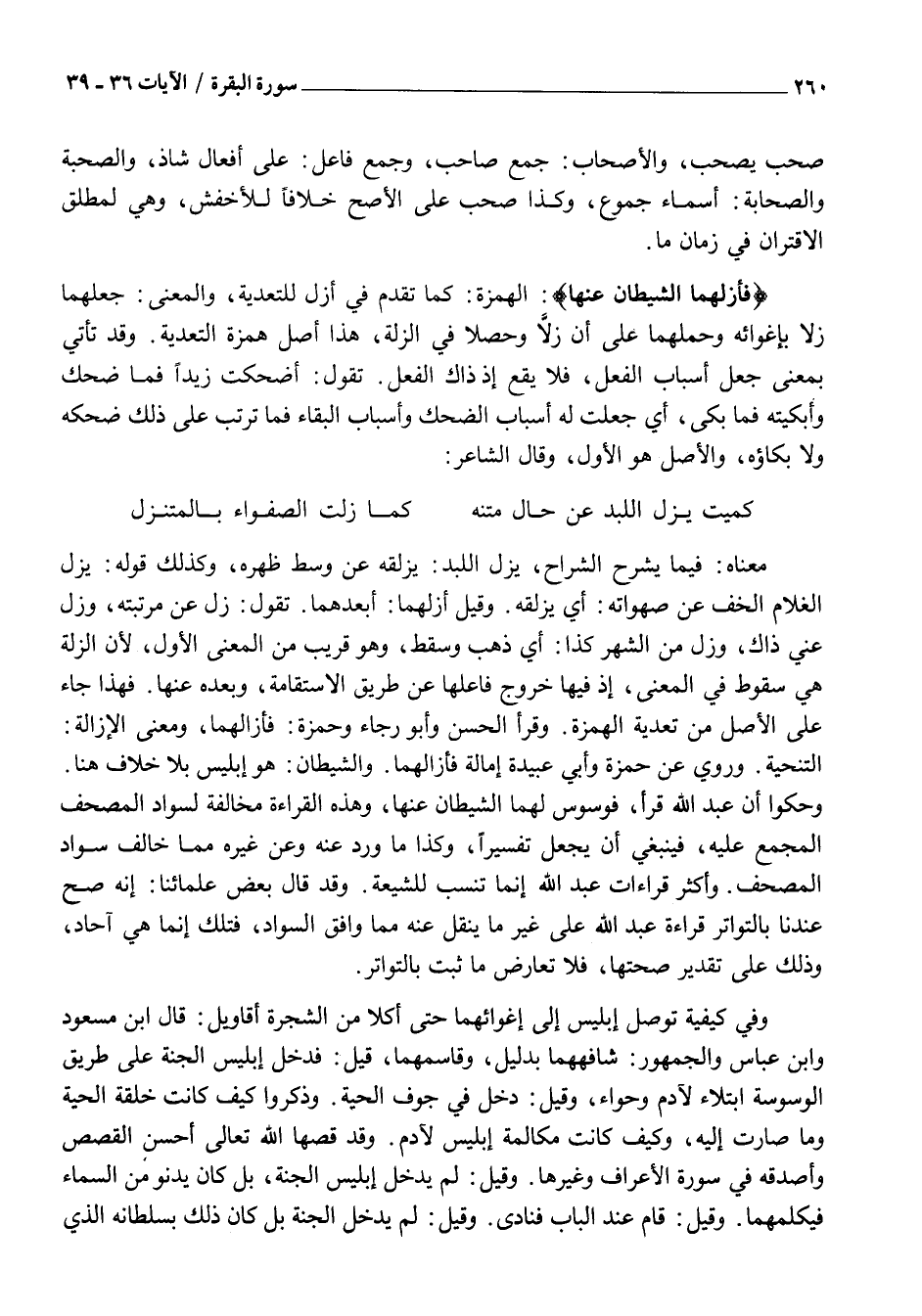 مَعْنَاهُ: فِيمَا يَشْرَحُ الشُّرَّاحُ، يَزِلُّ اللِّبْدُ: يَزْلِقُهُ عَنْ وَسَطِ ظَهْرِهِ، وَكَذَلِكَ قَوْلُهُ: يَزِلُّ الْغُلَامُ الْخُفَّ عَنْ صَهَوَاتِهِ: أَيْ يَزْلِقُهُ. وَقِيلَ أَزَلَّهُمَا: أَبْعَدَهُمَا. تَقُولُ: زَلَّ عَنْ مَرْتَبَتِهِ، وَزَلَّ عَنِّي ذَاكَ، وَزَلَّ مِنَ الشَّهْرِ كَذَا: أَيْ ذَهَبَ وَسَقَطَ، وَهُوَ قَرِيبٌ مِنَ الْمَعْنَى الْأَوَّلِ، لِأَنَّ الزَّلَّةَ هِيَ سُقُوطٌ فِي الْمَعْنَى، إِذْ فِيهَا خُرُوجُ فَاعِلِهَا عَنْ طَرِيقِ الِاسْتِقَامَةِ، وَبُعْدُهُ عَنْهَا. فَهَذَا جَاءَ عَلَى الْأَصْلِ مِنْ تَعْدِيَةِ الْهَمْزَةِ. وَقَرَأَ الْحَسَنُ وَأَبُو رَجَاءٍ وَحَمْزَةُ: فَأَزَالَهُمَا، وَمَعْنَى الْإِزَالَةِ: