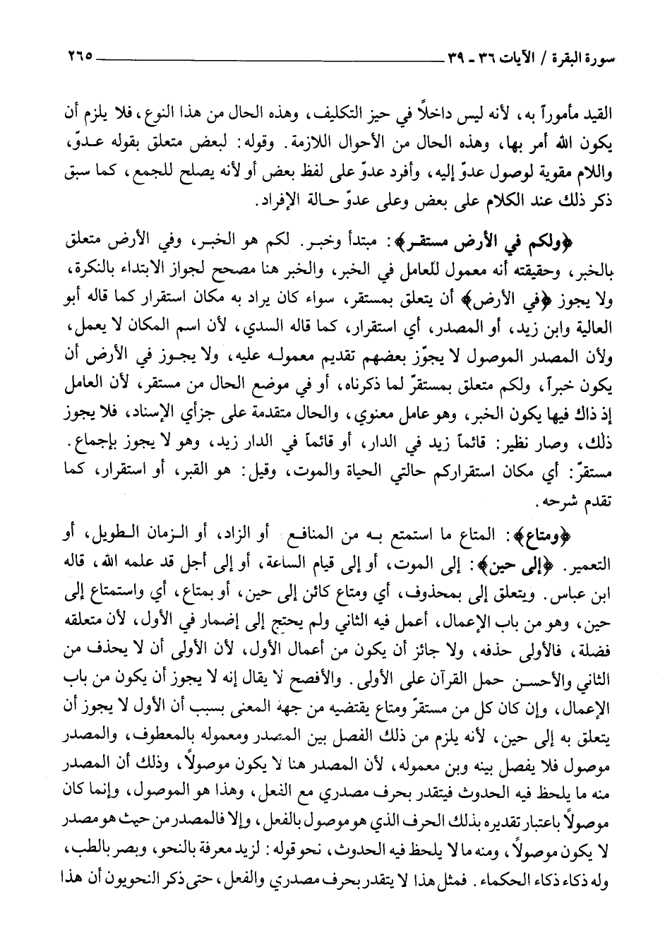 وَمَتاعٌ: الْمَتَاعُ مَا اسْتُمْتِعَ بِهِ مِنَ الْمَنَافِعِ، أَوِ الزَّادِ، أَوِ الزَّمَانِ الطَّوِيلِ، أَوِ التَّعْمِيرِ. إِلى حِينٍ: إِلَى الْمَوْتِ، أَوْ إِلَى قِيَامِ السَّاعَةِ، أَوْ إِلَى أَجَلٍ قَدْ عَلِمَهُ اللَّهُ، قَالَهُ ابْنُ عَبَّاسٍ. وَيَتَعَلَّقُ إِلَى بِمَحْذُوفٍ، أَيْ وَمَتَاعٌ كَائِنٌ إِلَى حِينٍ، أَوْ بِمَتَاعٍ، أَيْ وَاسْتِمْتَاعٍ إِلَى حِينٍ، وَهُوَ مِنْ بَابِ الْإِعْمَالِ، أُعْمِلُ فِيهِ الثَّانِي وَلَمْ يَحْتَجْ إِلَى إِضْمَارٍ فِي الْأَوَّلِ، لِأَنَّ مُتَعَلِّقَهُ فَضْلَةٌ، فَالْأَوْلَى حَذْفُهُ، وَلَا جَائِزَ أَنْ يَكُونَ مِنْ إِعْمَالِ الْأَوَّلِ، لِأَنَّ الْأَوْلَى أَنْ لَا يُحْذَفَ مِنَ الثَّانِي وَالْأَحْسَنُ حَمْلُ الْقُرْآنِ عَلَى الْأَوْلَى. وَالْأَفْصَحُ لَا يُقَالُ إِنَّهُ لَا يَجُوزُ أَنْ يَكُونَ مِنْ بَابِ الْإِعْمَالِ، وَإِنْ كَانَ كُلٌّ مِنْ مُسْتَقَرٌّ وَمَتَاعٌ يَقْتَضِيهِ مِنْ جِهَةِ الْمَعْنَى بِسَبَبِ أَنَّ الْأَوَّلِ لَا يَجُوزُ أَنْ يَتَعَلَّقَ بِهِ إِلَى حِينٍ، لِأَنَّهُ يَلْزَمُ مِنْ ذَلِكَ الْفَصْلُ بَيْنَ الْمَصْدَرِ وَمَعْمُولِهِ بِالْمَعْطُوفِ، وَالْمَصْدَرُ مَوْصُولٌ فلا يفصل بينه وبن مَعْمُولِهِ، لِأَنَّ الْمَصْدَرَ هُنَا لَا يَكُونُ مَوْصُولًا، وَذَلِكَ أَنَّ الْمَصْدَرَ مِنْهُ مَا يُلْحَظُ فِيهِ الْحُدُوثُ فَيُتَقَدَّرُ بِحَرْفٍ مَصْدَرِيٍّ مَعَ الْفِعْلِ، وَهَذَا هُوَ الْمَوْصُولُ، وَإِنَّمَا كَانَ مَوْصُولًا بِاعْتِبَارِ تَقْدِيرِهِ بِذَلِكَ الْحَرْفِ الَّذِي هُوَ مَوْصُولٌ بِالْفِعْلِ، وَإِلَّا فَالْمَصْدَرُ مِنْ حَيْثُ هُوَ مَصْدَرٌ لَا يَكُونُ مَوْصُولًا، وَمِنْهُ مَا لَا يُلْحَظُ فِيهِ الْحُدُوثُ، نَحْوَ قَوْلِهِ: لِزَيْدٍ مَعْرِفَةٌ بِالنَّحْوِ، وَبَصَرٌ بِالطِّبِّ، وَلَهُ ذَكَاءٌ ذَكَاءُ الْحُكَمَاءِ. فَمِثْلَ هَذَا لَا يُتَقَدَّرُ بِحَرْفٍ مَصْدَرِيٍّ وَالْفِعْلِ، حَتَّى ذَكَرَ النَّحْوِيُّونَ أَنَّ هَذَا