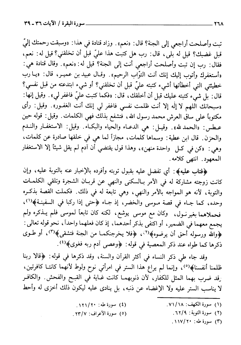 وَقِيلَ: هِيَ الدُّعَاءُ وَالْحَيَاءُ وَالْبُكَاءُ. وَقِيلَ: الِاسْتِغْفَارُ وَالنَّدَمُ وَالْحُزْنُ. قَالَ ابْنُ عَطِيَّةَ: وَسَمَّاهَا كَلِمَاتٍ، مَجَازًا لِمَا هِيَ فِي خَلْقِهَا صَادِرَةٌ عَنْ كَلِمَاتٍ، وَهِيَ: «كُنْ فِي كُلِّ وَاحِدَةٍ مِنْهُنَّ» ، وَهَذَا قَوْلٌ يَقْتَضِي أَنَّ آدَمَ لَمْ يَقُلْ شَيْئًا إِلَّا الِاسْتِغْفَارَ الْمَعْهُودَ. انْتَهَى كَلَامُهُ.