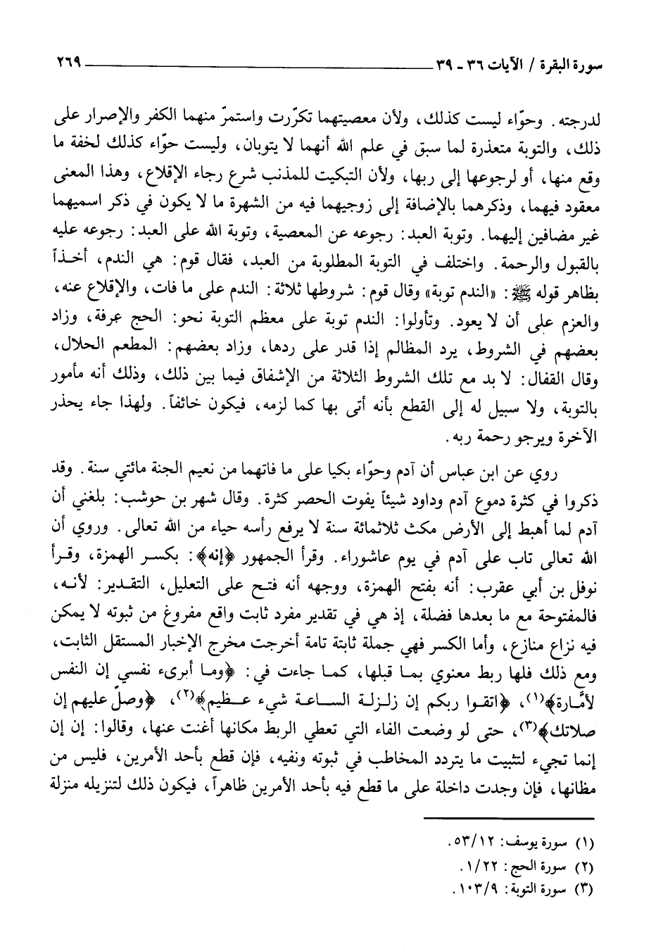 لِدَرَجَتِهِ. وَحَوَّاءُ لَيْسَتْ كَذَلِكَ، وَلِأَنَّ مَعْصِيَتَهُمَا تَكَرَّرَتْ وَاسْتَمَرَّ مِنْهُمَا الْكُفْرُ وَالْإِصْرَارُ عَلَى ذَلِكَ، وَالتَّوْبَةُ مُتَعَذِّرَةٌ لِمَا سَبَقَ فِي عِلْمِ اللَّهِ أَنَّهُمَا لَا يَتُوبَانِ، وَلَيْسَتْ حَوَّاءُ كَذَلِكَ لِخِفَّةِ مَا وَقَعَ مِنْهَا، أَوْ لِرُجُوعِهَا إِلَى رَبِّهَا، وَلِأَنَّ التَّبْكِيتَ لِلْمُذْنِبِ شَرْعُ رَجَاءِ الْإِقْلَاعِ، وَهَذَا الْمَعْنَى مَعْقُودٌ فِيهِمَا، وَذِكْرُهُمَا بِالْإِضَافَةِ إِلَى زَوْجَيْهِمَا فِيهِ مِنَ الشُّهْرَةِ مَا لَا يَكُونُ فِي ذِكْرِ اسْمَيْهِمَا غَيْرَ مُضَافَيْنِ إِلَيْهِمَا. وَتَوْبَةُ الْعَبْدِ: رُجُوعُهُ عَنِ الْمَعْصِيَةِ، وَتَوْبَةُ اللَّهِ عَلَى الْعَبْدِ: رُجُوعُهُ عَلَيْهِ بِالْقَبُولِ وَالرَّحْمَةِ. وَاخْتُلِفَ فِي التَّوْبَةِ الْمَطْلُوبَةِ مِنَ الْعَبْدِ، فَقَالَ قَوْمٌ: هِيَ النَّدَمُ، أَخْذًا بِظَاهِرِ