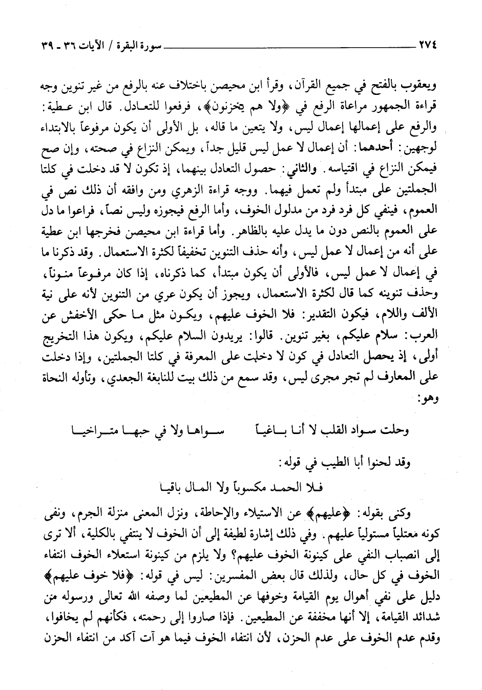 وَالرَّفْعُ عَلَى إِعْمَالِهَا إِعْمَالَ لَيْسَ، وَلَا يَتَعَيَّنُ مَا قَالَهُ، بَلِ الْأَوْلَى أَنْ يَكُونَ مَرْفُوعًا بِالِابْتِدَاءِ لِوَجْهَيْنِ: أَحَدُهُمَا: أَنَّ إِعْمَالَ لَا عَمَلَ لَيْسَ قَلِيلٌ جِدًّا، وَيُمْكِنُ النِّزَاعُ فِي صِحَّتِهِ، وَإِنْ صَحَّ فَيُمْكِنُ النِّزَاعُ فِي اقْتِيَاسِهِ. وَالثَّانِي: حُصُولُ التَّعَادُلِ بَيْنَهُمَا، إِذْ تَكُونُ لَا قَدْ دَخَلَتْ فِي كِلْتَا الْجُمْلَتَيْنِ عَلَى مُبْتَدَأٍ وَلَمْ تَعْمَلْ فِيهِمَا. وَوَجْهُ قِرَاءَةِ الزُّهْرِيِّ وَمَنْ وَافَقَهُ أَنَّ ذَلِكَ نَصٌّ فِي الْعُمُومِ، فَيَنْفِي كُلَّ فَرْدٍ فَرْدٍ مِنْ مَدْلُولِ الْخَوْفِ، وَأَمَّا الرَّفْعُ فَيُجَوِّزُهُ وَلَيْسَ نَصًّا، فَرَاعَوْا مَا دَلَّ عَلَى الْعُمُومِ بِالنَّصِّ دُونَ مَا يَدُلُّ عَلَيْهِ بِالظَّاهِرِ. وَأَمَّا قِرَاءَةُ ابْنِ مُحَيْصِنٍ فَخَرَّجَهَا ابْنُ عَطِيَّةَ عَلَى أَنَّهُ مِنْ إِعْمَالِ لَا عَمَلَ لَيْسَ، وَأَنَّهُ حَذَفَ التَّنْوِينَ تَخْفِيفًا لِكَثْرَةِ الِاسْتِعْمَالِ. وَقَدْ ذَكَرْنَا مَا فِي إعمال لا عمل ليس، فَالْأَوْلَى أَنْ يَكُونَ مُبْتَدَأً، كَمَا ذَكَرْنَاهُ، إِذَا كَانَ مَرْفُوعًا مُنَوَّنًا، وَحُذِفَ تَنْوِينُهُ كَمَا قَالَ لِكَثْرَةِ الِاسْتِعْمَالِ، وَيَجُوزُ أَنْ يَكُونَ عُرِّيَ مِنَ التَّنْوِينِ لِأَنَّهُ عَلَى نِيَّةِ الْأَلِفِ وَاللَّامِ، فَيَكُونُ التَّقْدِيرُ: فَلَا الْخَوْفُ عَلَيْهِمْ، وَيَكُونُ مِثْلَ مَا حَكَى الْأَخْفَشُ عَنِ الْعَرَبِ: سَلَامُ عَلَيْكُمْ، بِغَيْرِ تَنْوِينٍ. قَالُوا: يُرِيدُونَ السَّلَامُ عَلَيْكُمْ، وَيَكُونُ هَذَا التَّخْرِيجُ أَوْلَى، إِذْ يَحْصُلُ التَّعَادُلُ فِي كَوْنِ لَا دَخَلَتْ عَلَى الْمَعْرِفَةِ فِي كِلْتَا الْجُمْلَتَيْنِ، وَإِذَا دَخَلَتْ عَلَى الْمَعَارِفِ لَمْ تُجْرَ مَجْرَى لَيْسَ، وَقَدْ سُمِعَ مِنْ ذَلِكَ بَيْتٌ لِلنَّابِغَةِ الْجَعْدِيِّ، وَتَأَوَّلَهُ النُّحَاةُ وَهُوَ: