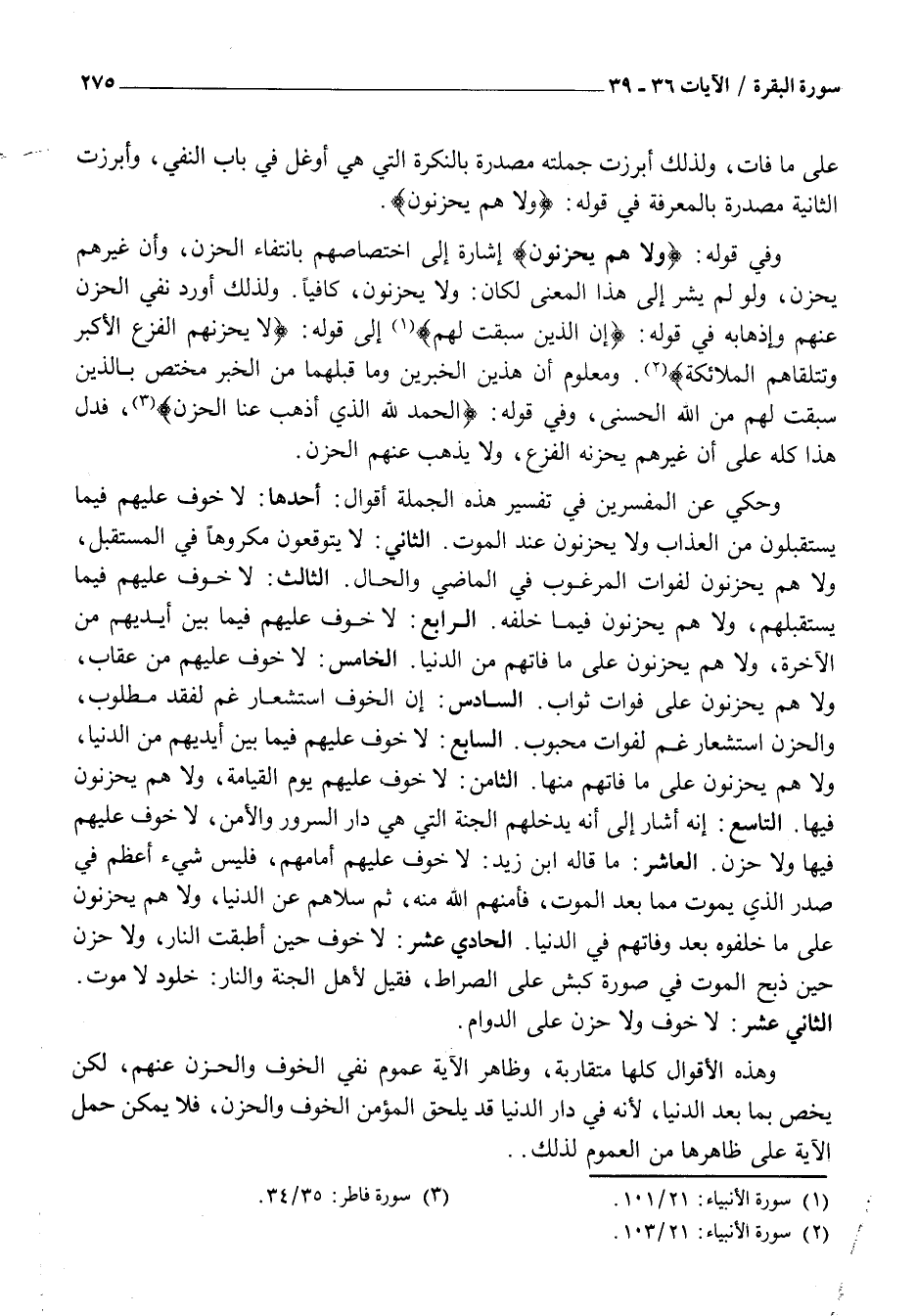 وَحُكِيَ عَنِ الْمُفَسِّرِينَ فِي تَفْسِيرِ هَذِهِ الْجُمْلَةِ أَقْوَالٌ: أَحَدُهَا: لَا خَوْفٌ عَلَيْهِمْ فِيمَا يَسْتَقْبِلُونَ مِنَ الْعَذَابِ وَلَا يَحْزَنُونَ عِنْدَ الْمَوْتِ. الثَّانِي: لَا يَتَوَقَّعُونَ مَكْرُوهًا فِي الْمُسْتَقْبَلِ، وَلَا هُمْ يَحْزَنُونَ لِفَوَاتِ الْمَرْغُوبِ فِي الْمَاضِي وَالْحَالِ. الثَّالِثُ: لَا خَوْفٌ عَلَيْهِمْ فِيمَا يَسْتَقْبِلُهُمْ، وَلَا هُمْ يَحْزَنُونَ فِيمَا خَلْفَهُ. الرَّابِعُ: لَا خَوْفٌ عَلَيْهِمْ فِيمَا بَيْنَ أَيْدِيهِمْ مِنَ الْآخِرَةِ، وَلَا هُمْ يَحْزَنُونَ عَلَى مَا فَاتَهُمْ مِنَ الدُّنْيَا. الْخَامِسُ: لَا خَوْفٌ عَلَيْهِمْ مِنْ عِقَابٍ، وَلَا هُمْ يَحْزَنُونَ عَلَى فَوَاتِ ثَوَابٍ. السَّادِسُ: إِنَّ الْخَوْفَ اسْتِشْعَارُ غَمٍّ لِفَقْدِ مَطْلُوبٍ، وَالْحُزْنَ اسْتِشْعَارُ غَمٍّ لِفَوَاتِ مَحْبُوبٍ. السَّابِعُ: لَا خَوْفٌ عَلَيْهِمْ فِيمَا بَيْنَ أَيْدِيهِمْ مِنَ الدُّنْيَا، وَلَا هُمْ يَحْزَنُونَ عَلَى مَا فَاتَهُمْ مِنْهَا. الثَّامِنُ: لَا خَوْفٌ عَلَيْهِمْ يَوْمَ الْقِيَامَةِ، وَلَا هُمْ يَحْزَنُونَ فِيهَا. التَّاسِعُ: أَنَّهُ أَشَارَ إِلَى أَنَّهُ يُدْخِلُهُمُ الْجَنَّةَ الَّتِي هِيَ دَارُ السُّرُورِ وَالْأَمْنِ، لَا خَوْفٌ عَلَيْهِمْ فِيهَا وَلَا حُزْنٌ. الْعَاشِرُ: مَا قَالَهُ ابْنُ زَيْدٍ: لَا خَوْفٌ عَلَيْهِمْ أَمَامَهُمْ، فَلَيْسَ شَيْءٌ أَعْظَمَ فِي صَدْرِ الَّذِي يَمُوتُ مِمَّا بَعْدَ الْمَوْتِ، فَأَمَّنَهُمُ اللَّهُ مِنْهُ، ثُمَّ سَلَّاهُمْ عَنِ الدُّنْيَا، وَلَا هُمْ يَحْزَنُونَ عَلَى مَا خَلَّفُوهُ بَعْدَ وَفَاتِهِمْ فِي الدُّنْيَا. الْحَادِي عَشَرَ: لَا خَوْفٌ حِينَ أَطْبَقَتِ النَّارُ، وَلَا حُزْنٌ حِينَ ذُبِحَ الْمَوْتُ فِي صُورَةِ كَبْشٍ عَلَى الصِّرَاطِ، فَقِيلَ لِأَهْلِ الْجَنَّةِ وَالنَّارِ: خلود لا مَوْتٌ.
