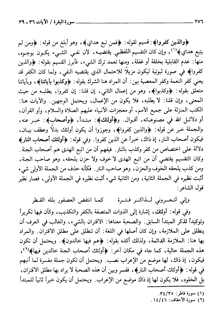 وَكَانَ التَّقْسِيمُ يَقْتَضِي أَنَّ مَنِ اتَّبَعَ الْهُدَى لَا خَوْفٌ وَلَا حَزْنٌ يَلْحَقُهُ، وَهُوَ صَاحِبُ الْجَنَّةِ، وَمَنْ كَذَّبَ يَلْحَقُهُ الْخَوْفُ وَالْحُزْنُ، وَهُوَ صَاحِبُ النَّارِ. فَكَأَنَّهُ حُذِفَ مِنَ الْجُمْلَةِ الْأُولَى شَيْءٌ أُثْبِتَ نَظِيرُهُ فِي الْجُمْلَةِ الثَّانِيَةِ، وَمِنَ الثَّانِيَةِ شَيْءٌ أُثْبِتَ نَظِيرُهُ فِي الْجُمْلَةِ الْأُولَى، فَصَارَ نَظِيرَ قَوْلِ الشَّاعِرِ: