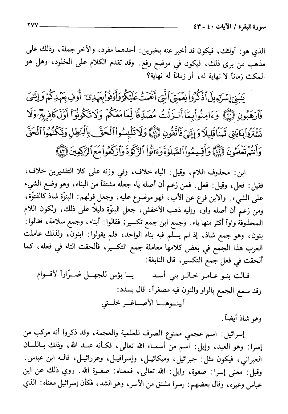 يَا بَنِي إِسْرائِيلَ اذْكُرُوا نِعْمَتِيَ الَّتِي أَنْعَمْتُ عَلَيْكُمْ وَأَوْفُوا بِعَهْدِي أُوفِ بِعَهْدِكُمْ وَإِيَّايَ فَارْهَبُونِ (40) وَآمِنُوا بِما أَنْزَلْتُ مُصَدِّقاً لِما مَعَكُمْ وَلا تَكُونُوا أَوَّلَ كافِرٍ بِهِ وَلا تَشْتَرُوا بِآياتِي ثَمَناً قَلِيلاً وَإِيَّايَ فَاتَّقُونِ (41) وَلا تَلْبِسُوا الْحَقَّ بِالْباطِلِ وَتَكْتُمُوا الْحَقَّ وَأَنْتُمْ تَعْلَمُونَ (42) وَأَقِيمُوا الصَّلاةَ وَآتُوا الزَّكاةَ وَارْكَعُوا مَعَ الرَّاكِعِينَ (43)