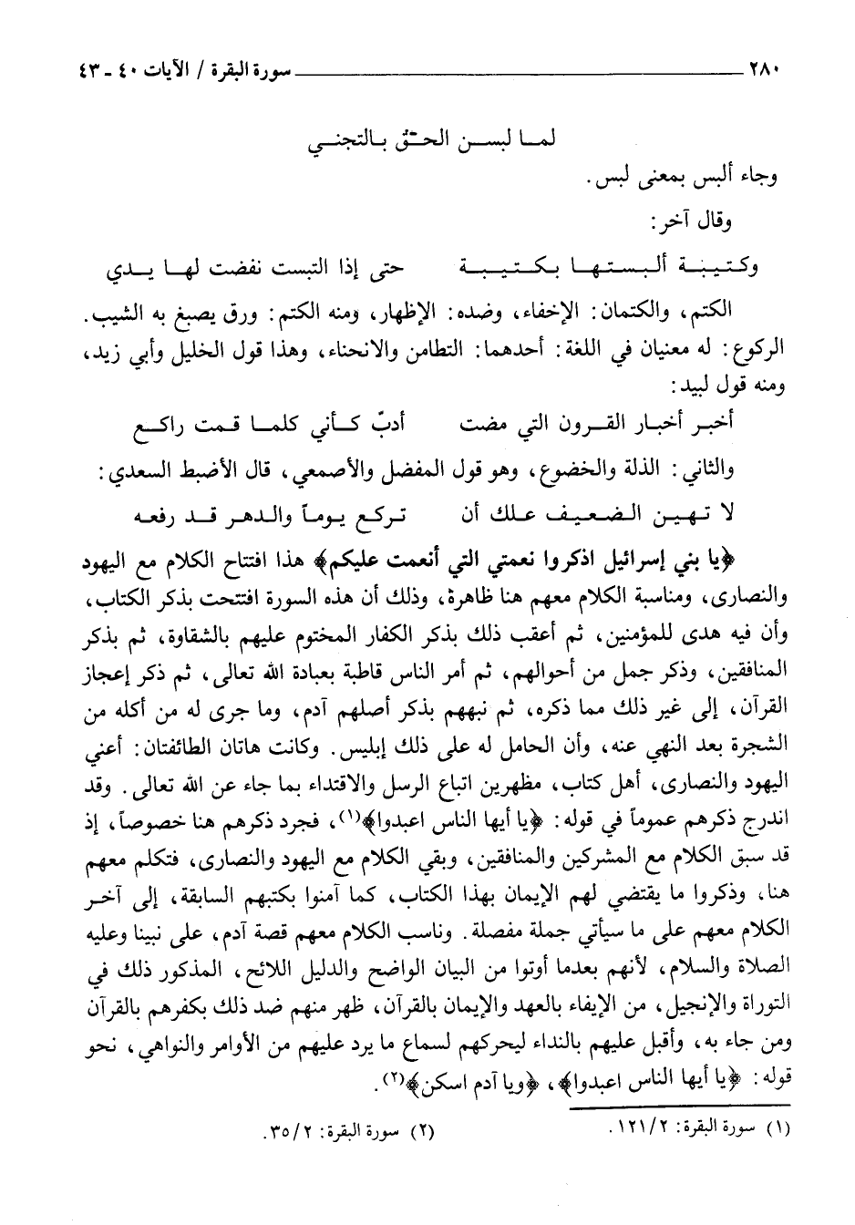 يَا بَنِي إِسْرائِيلَ اذْكُرُوا نِعْمَتِيَ الَّتِي أَنْعَمْتُ عَلَيْكُمْ هَذَا افْتِتَاحُ الْكَلَامِ مَعَ الْيَهُودِ وَالنَّصَارَى، وَمُنَاسَبَةُ الْكَلَامِ مَعَهُمْ هُنَا ظَاهِرَةٌ، وَذَلِكَ أَنَّ هَذِهِ السُّورَةَ افْتُتِحَتْ بِذِكْرِ الْكِتَابِ، وَأَنَّ فِيهِ هُدًى لِلْمُؤْمِنِينَ، ثُمَّ أَعْقَبَ ذَلِكَ بِذِكْرِ الْكُفَّارِ الْمَخْتُومِ عَلَيْهِمْ بِالشَّقَاوَةِ، ثُمَّ بِذِكْرِ الْمُنَافِقِينَ، وَذِكْرِ جُمَلٍ مِنْ أَحْوَالِهِمْ، ثُمَّ أَمَرَ النَّاسَ قَاطِبَةً بِعِبَادَةِ اللَّهِ تَعَالَى، ثُمَّ ذَكَرَ إِعْجَازَ الْقُرْآنِ، إِلَى غَيْرِ ذَلِكَ مِمَّا ذَكَرَهُ، ثُمَّ نَبَّهَهُمْ بِذِكْرِ أَصْلِهِمْ آدَمَ، وَمَا جَرَى لَهُ مِنْ أَكْلِهِ مِنَ الشَّجَرَةِ بَعْدَ النَّهْيِ عَنْهُ، وَأَنَّ الْحَامِلَ لَهُ عَلَى ذَلِكَ إِبْلِيسُ. وَكَانَتْ هَاتَانِ الطَّائِفَتَانِ: أَعْنِي الْيَهُودَ وَالنَّصَارَىَ، أَهْلَ كِتَابٍ، مُظْهِرِينَ اتِّبَاعَ الرُّسُلِ وَالِاقْتِدَاءَ بِمَا جَاءَ عَنِ اللَّهِ تَعَالَى. وَقَدِ انْدَرَجَ ذِكْرُهُمْ عُمُومًا فِي قَوْلِهِ: يَا أَيُّهَا النَّاسُ اعْبُدُوا «1» ، فَجَرَّدَ ذِكْرَهُمْ هُنَا خُصُوصًا، إِذْ قَدْ سَبَقَ الْكَلَامُ مَعَ الْمُشْرِكِينَ وَالْمُنَافِقِينَ، وَبَقِيَ الْكَلَامُ مَعَ الْيَهُودِ وَالنَّصَارَى، فَتَكَلَّمَ مَعَهُمْ هُنَا، وَذَكَرُوا مَا يَقْتَضِي لَهُمُ الْإِيمَانَ بِهَذَا الْكِتَابِ، كَمَا آمَنُوا بِكُتُبِهِمُ السَّابِقَةِ، إِلَى آخِرِ الْكَلَامِ مَعَهُمْ عَلَى مَا سَيَأْتِي جُمْلَةً مُفَصَّلَةً. وَنَاسَبَ الْكَلَامَ مَعَهُمْ قِصَّةَ آدَمَ، عَلَى نَبِيِّنَا وَعَلَيْهِ الصلاة والسلام، لأنهم بعد ما أُوتُوا مِنَ الْبَيَانِ الْوَاضِحِ وَالدَّلِيلِ اللَّائِحِ، الْمَذْكُورِ ذَلِكَ فِي التَّوْرَاةِ وَالْإِنْجِيلِ، مِنْ الْإِيفَاءِ بِالْعَهْدِ وَالْإِيمَانِ بِالْقُرْآنِ، ظَهَرَ مِنْهُمْ ضِدُّ ذَلِكَ بِكُفْرِهِمْ بِالْقُرْآنِ وَمَنْ جَاءَ بِهِ، وَأَقْبَلَ عَلَيْهِمْ بِالنِّدَاءِ لِيُحَرِّكَهُمْ لِسَمَاعِ مَا يَرِدُ عَلَيْهِمْ مِنَ الْأَوَامِرِ وَالنَّوَاهِي، نَحْوَ قَوْلِهِ: يَا أَيُّهَا النَّاسُ اعْبُدُوا، وَيا آدَمُ اسْكُنْ «2» .