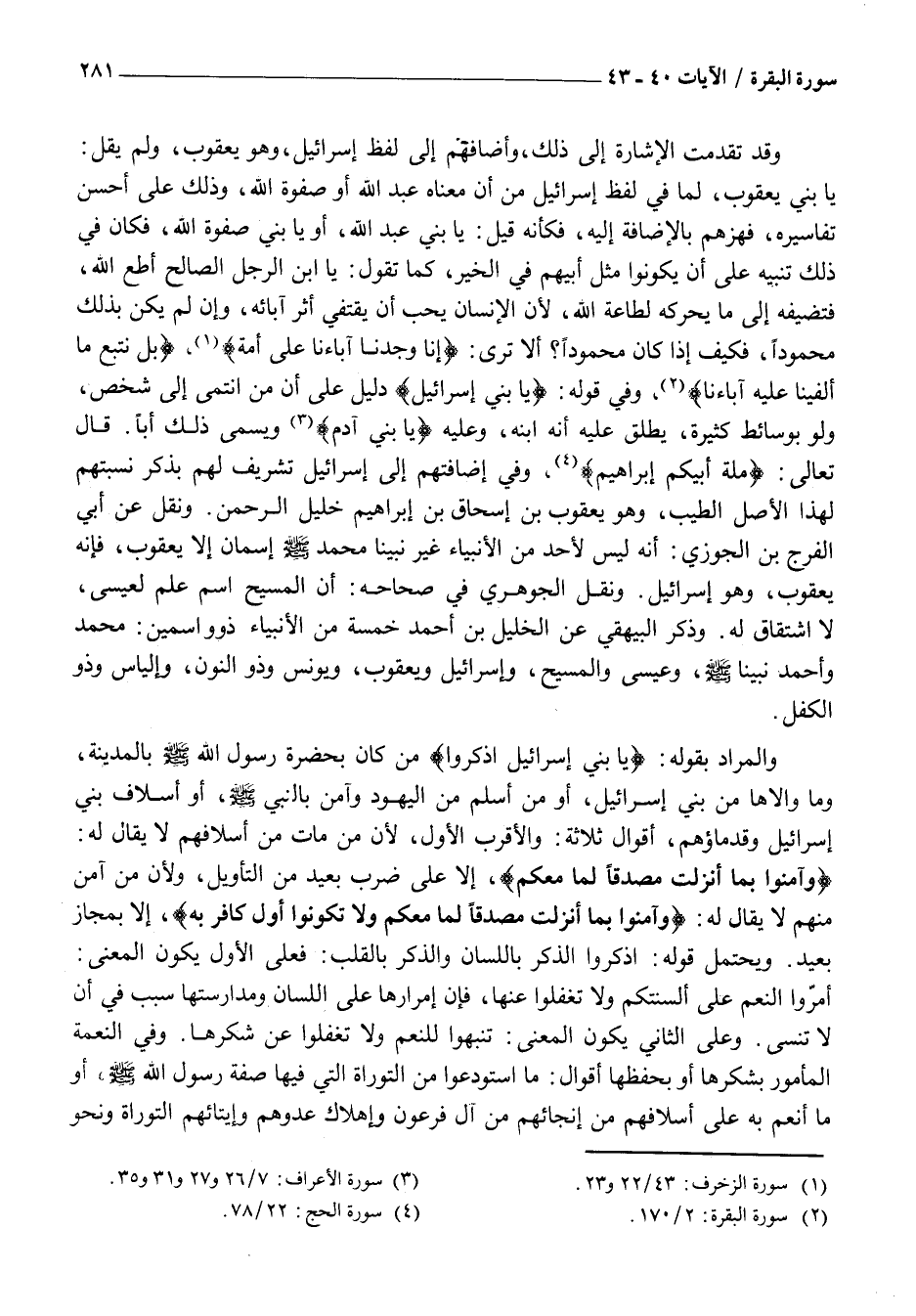 وَآمِنُوا بِما أَنْزَلْتُ مُصَدِّقاً لِما مَعَكُمْ، إِلَّا عَلَى ضَرْبٍ بَعِيدٍ مِنَ التَّأْوِيلِ، وَلِأَنَّ مَنْ آمَنَ مِنْهُمْ لَا يُقَالُ لَهُ: وَآمِنُوا بِما أَنْزَلْتُ مُصَدِّقاً لِما مَعَكُمْ وَلا تَكُونُوا أَوَّلَ كافِرٍ بِهِ، إِلَّا بِمَجَازٍ بَعِيدٍ. وَيَحْتَمِلُ قَوْلُهُ: اذْكُرُوا الذِّكْرَ بِاللِّسَانِ وَالذِّكْرَ بِالْقَلْبِ: فَعَلَى الْأَوَّلِ يَكُونُ الْمَعْنَى: