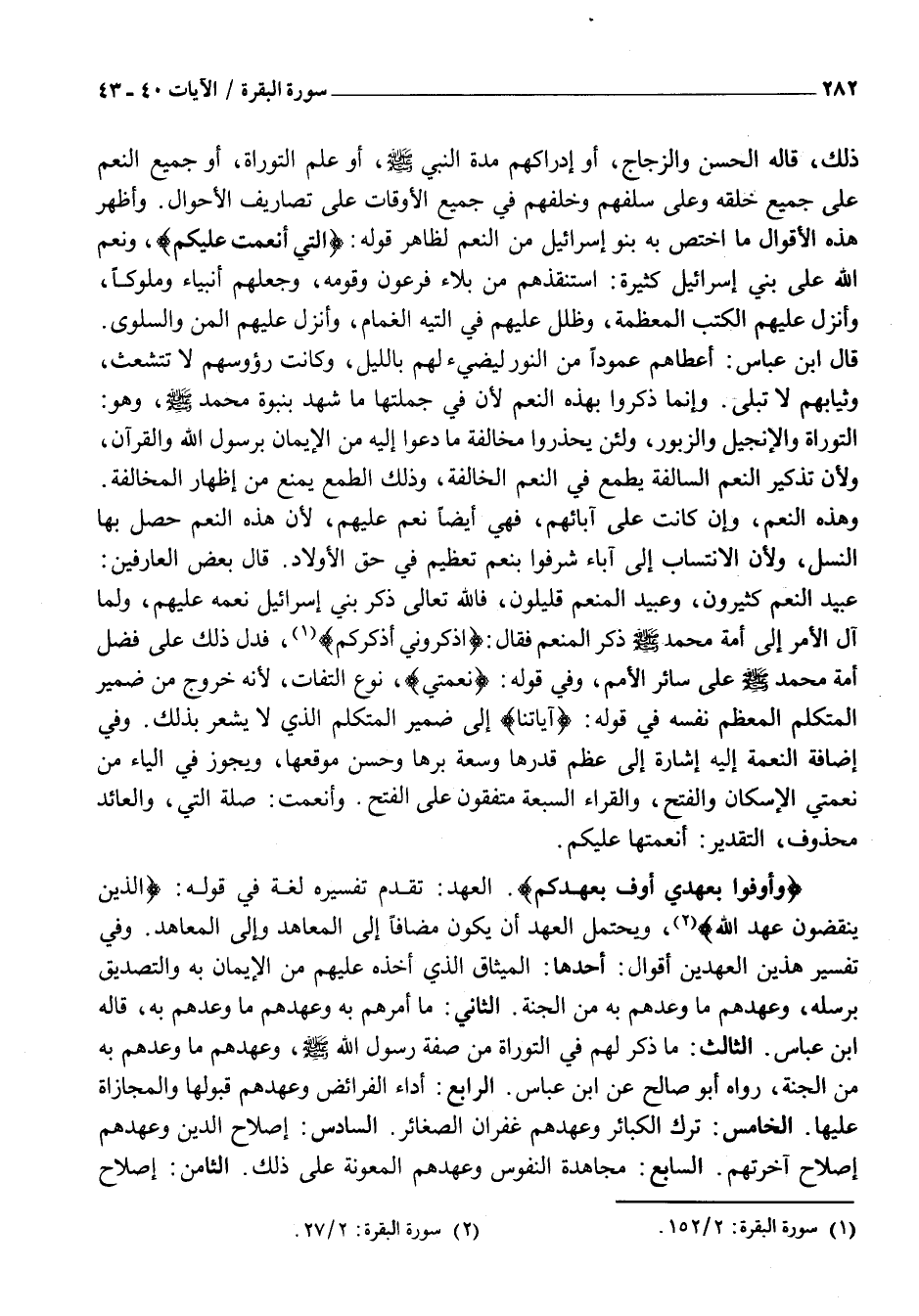 وَأَوْفُوا بِعَهْدِي أُوفِ بِعَهْدِكُمْ. الْعَهْدُ: تَقَدَّمَ تَفْسِيرُهُ لُغَةً فِي قَوْلِهِ: الَّذِينَ يَنْقُضُونَ عَهْدَ اللَّهِ «2» ، وَيَحْتَمِلُ الْعَهْدُ أَنْ يَكُونَ مُضَافًا إِلَى الْمُعَاهِدِ وَإِلَى الْمُعَاهَدِ. وَفِي تَفْسِيرِ هَذَيْنِ الْعَهْدَيْنِ أَقْوَالٌ: أَحَدُهَا: الْمِيثَاقُ الَّذِي أَخَذَهُ عَلَيْهِمْ مِنَ الْإِيمَانِ بِهِ وَالتَّصْدِيقِ بِرُسُلِهِ، وَعَهْدُهُمْ مَا وَعَدَهُمْ بِهِ مِنَ الْجَنَّةِ. الثَّانِي: مَا أَمَرَهُمْ بِهِ وَعَهْدُهُمْ مَا وَعَدَهُمْ بِهِ، قَالَهُ ابْنُ عَبَّاسٍ. الثَّالِثُ: مَا ذُكِرَ لَهُمْ فِي التَّوْرَاةِ مِنْ صِفَةِ رَسُولِ اللَّهِ صَلَّى الله عليه وسلم، وَعَهْدُهُمْ مَا وَعَدَهُمْ بِهِ مِنَ الْجَنَّةِ، رَوَاهُ أَبُو صَالِحٍ عَنِ ابْنِ عَبَّاسٍ. الرَّابِعُ: أَدَاءُ الْفَرَائِضِ وَعَهْدُهُمْ قَبُولُهَا وَالْمُجَازَاةُ عَلَيْهَا. الْخَامِسُ: تَرْكُ الْكَبَائِرِ وَعَهْدُهُمْ غُفْرَانُ الصَّغَائِرِ. السَّادِسُ: إِصْلَاحُ الدِّينِ وَعَهْدُهُمْ إِصْلَاحُ آخِرَتِهِمْ. السَّابِعُ: مُجَاهَدَةُ النُّفُوسِ وَعَهْدُهُمُ الْمَعُونَةُ عَلَى ذَلِكَ. الثَّامِنُ: إِصْلَاحُ