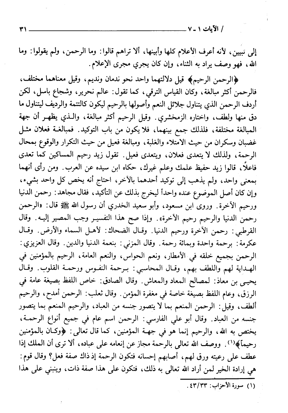 الرَّحْمَنُ بِجَمِيعِ خَلْقِهِ فِي الْأَمْطَارِ، وَنِعَمِ الْحَوَاسِّ، وَالنِّعَمِ الْعَامَّةِ، الرَّحِيمُ بِالْمُؤْمِنِينَ فِي الْهِدَايَةِ لَهُمْ وَاللُّطْفِ بِهِمْ، وَقَالَ الْمُحَاسِبِيُّ: بِرَحْمَةِ النُّفُوسِ وَرَحْمَةِ الْقُلُوبِ. وَقَالَ يَحْيَى بْنُ مُعَاذٍ: لِمَصَالِحِ الْمَعَادِ وَالْمَعَاشِ. وَقَالَ الصَّادِقُ: خَاصُّ اللَّفْظِ بِصِيغَةٍ عَامَّةٍ فِي الرِّزْقِ، وَعَامُّ اللَّفْظِ بِصِيغَةٍ خَاصَّةٍ فِي مَغْفِرَةِ الْمُؤْمِنِ. وَقَالَ ثَعْلَبٌ: الرَّحْمَنُ أَمْدَحُ، وَالرَّحِيمُ أَلْطَفُ، وَقِيلَ: الرَّحْمَنُ الْمُنْعِمُ بِمَا لَا يُتَصَوَّرُ جِنْسُهُ مِنَ الْعِبَادِ، وَالرَّحِيمُ الْمُنْعِمُ بِمَا يُتَصَوَّرُ جِنْسُهُ مِنَ الْعِبَادِ. وَقَالَ أَبُو عَلِيٍّ الْفَارِسِيُّ: الرَّحْمَنُ اسْمٌ عَامٌّ فِي جَمِيعِ أَنْوَاعِ الرَّحْمَةِ، يَخْتَصُّ بِهِ اللَّهُ، وَالرَّحِيمُ إِنَّمَا هُوَ فِي جِهَةِ الْمُؤْمِنِينَ، كَمَا قَالَ تَعَالَى: وَكانَ بِالْمُؤْمِنِينَ رَحِيماً «1» . وَوَصْفُ اللَّهِ تَعَالَى بِالرَّحْمَةِ مَجَازٌ عَنْ إِنْعَامِهِ عَلَى عِبَادِهِ، أَلَا تَرَى أَنَّ الْمَلِكَ إِذَا عَطَفَ عَلَى رَعِيَّتِهِ وَرَقَّ لَهُمْ، أَصَابَهُمْ إِحْسَانُهُ فَتَكُونُ الرَّحْمَةُ إِذْ ذَاكَ صِفَةَ فِعْلٍ؟ وَقَالَ قَوْمٌ: