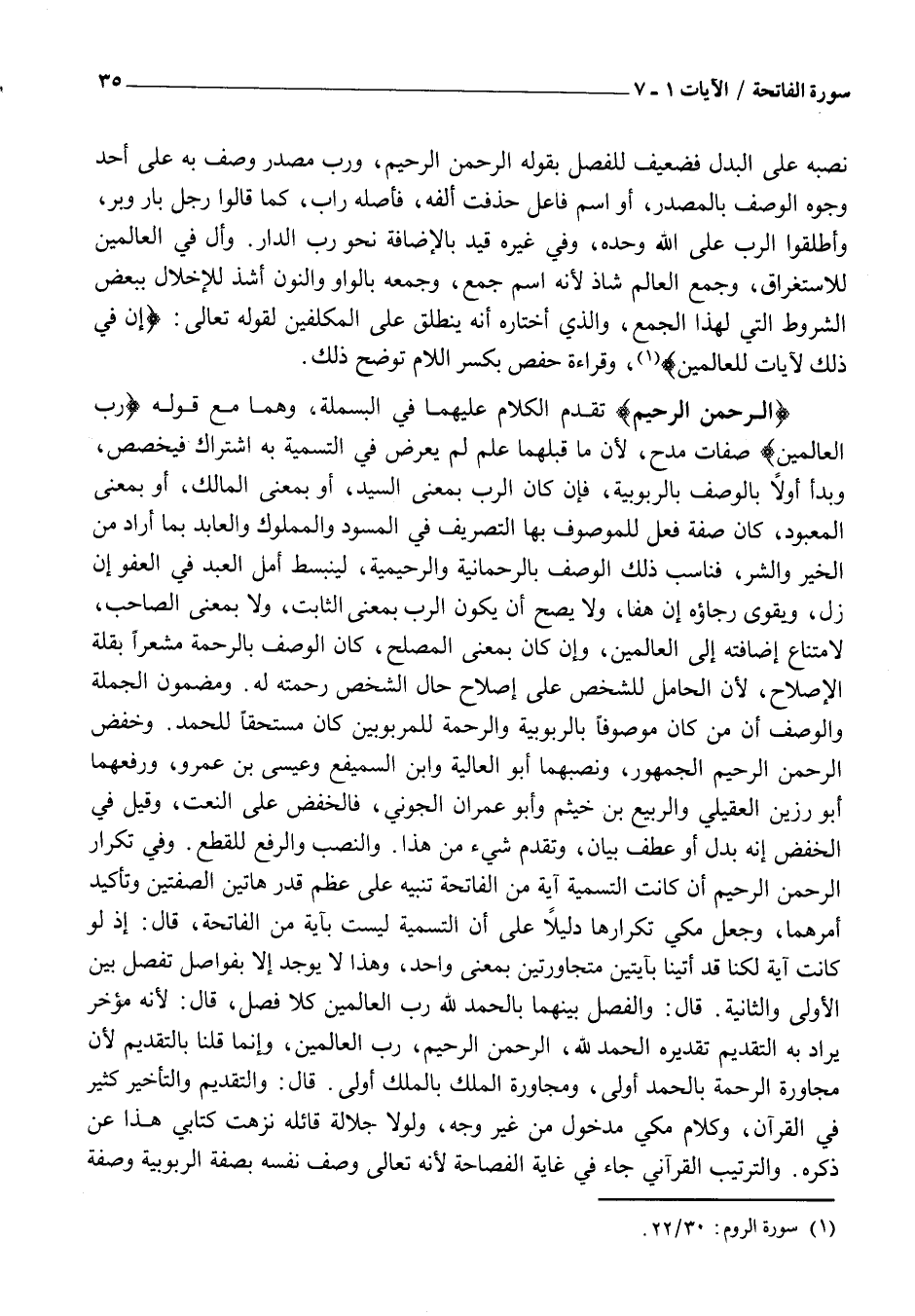 الرَّحْمنِ الرَّحِيمِ تَقَدَّمَ الْكَلَامُ عَلَيْهِمَا فِي الْبَسْمَلَةِ، وَهُمَا مَعَ قَوْلِهِ رَبِّ الْعالَمِينَ صِفَاتُ مَدْحٍ، لِأَنَّ مَا قَبْلَهُمَا عَلَمٌ لَمْ يَعْرِضْ فِي التَّسْمِيَةِ بِهِ اشْتَرَاكٌ فَيُخَصَّصُ، وَبَدَأَ أَوَّلًا بِالْوَصْفِ بِالرُّبُوبِيَّةِ، فَإِنْ كَانَ الرَّبُّ بِمَعْنَى السَّيِّدِ، أَوْ بِمَعْنَى الْمَالِكِ، أَوْ بِمَعْنَى الْمَعْبُودِ، كَانَ صِفَةَ فِعْلٍ لِلْمَوْصُوفِ بِهَا التَّصْرِيفُ فِي الْمَسُودِ وَالْمَمْلُوكِ وَالْعَابِدِ بِمَا أَرَادَ مِنَ الْخَيْرِ وَالشَّرِّ، فَنَاسَبَ ذَلِكَ الْوَصْفُ بِالرَّحْمَانِيَّةِ وَالرَّحِيمِيَّةِ، لِيَنْبَسِطَ أَمَلُ الْعَبْدِ فِي الْعَفْوِ إِنْ زَلَّ، وَيَقْوَى رَجَاؤُهُ إِنْ هَفَا، وَلَا يَصِحُّ أَنْ يَكُونَ الرَّبُّ بِمِعْنَى الثَّابِتِ، وَلَا بِمَعْنَى الصَّاحِبِ، لِامْتِنَاعِ إِضَافَتِهِ إِلَى الْعَالَمِينَ، وَإِنْ كَانَ بِمَعْنَى الْمُصْلِحِ، كَانَ الْوَصْفُ بِالرَّحْمَةِ مُشْعِرًا بِقِلَّةِ الْإِصْلَاحِ، لِأَنَّ الْحَامِلَ لِلشَّخْصِ عَلَى إِصْلَاحِ حَالِ الشَّخْصِ رَحْمَتُهُ لَهُ. وَمَضْمُونُ الْجُمْلَةِ وَالْوَصْفِ أَنَّ مَنْ كَانَ مَوْصُوفًا بِالرُّبُوبِيَّةِ وَالرَّحْمَةِ لِلْمَرْبُوبِينَ كَانَ مُسْتَحِقًّا لِلْحَمْدِ. وَخَفَضَ الرَّحْمَنِ الرَّحِيمِ الْجُمْهُورُ، وَنَصَبَهُمَا أَبُو الْعَالِيَةِ وَابْنُ السَّمَيْفَعِ وَعِيسَى بْنُ عَمْرٍو، وَرَفَعَهُمَا أَبُو رَزِينٍ الْعُقَيْلِيُّ وَالرَّبِيعُ بْنُ خَيْثَمٍ وَأَبُو عِمْرَانَ الْجُونِيُّ، فَالْخَفْضُ عَلَى النَّعْتِ، وَقِيلَ فِي الْخَفْضِ إِنَّهُ بَدَلٌ أَوْ عَطْفُ بَيَانٍ، وَتَقَدَّمَ شَيْءٌ مِنْ هَذَا. وَالنَّصْبُ وَالرَّفْعُ لِلْقَطْعِ. وَفِي تَكْرَارِ الرَّحْمَنِ الرَّحِيمِ إِنْ كَانَتِ التَّسْمِيَةُ آيَةً مِنَ الْفَاتِحَةِ تَنْبِيهٌ عَلَى عِظَمِ قَدْرِ هَاتَيْنِ الصِّفَتَيْنِ وَتَأْكِيدُ أَمْرِهِمَا، وَجَعَلَ مَكِّيٌّ تَكْرَارَهَا دَلِيلًا عَلَى أَنَّ التَّسْمِيَةَ لَيْسَتْ بِآيَةٍ مِنَ الْفَاتِحَةِ، قَالَ: إِذْ لَوْ كَانَتْ آيَةً لَكُنَّا قَدْ أَتَيْنَا بِآيَتَيْنِ مُتَجَاوِرَتَيْنِ بِمَعْنًى وَاحِدٍ، وَهَذَا لَا يُوجَدُ إِلَّا بِفَوَاصِلَ تَفْصِلُ بَيْنَ الْأُولَى وَالثَّانِيَةِ. قَالَ: والفصل بينهما بالحمد لِلَّهِ رَبِّ الْعَالَمِينَ كَلَا فَصْلٍ، قَالَ: لِأَنَّهُ مُؤَخَّرٌ يُرَادُ بِهِ التَّقْدِيمُ تَقْدِيرُهُ الْحَمْدُ لِلَّهِ، الرَّحْمَنِ الرَّحِيمِ، رَبِّ الْعَالَمِينَ، وَإِنَّمَا قُلْنَا بِالتَّقْدِيمِ لِأَنَّ مُجَاوَرَةَ الرَّحْمَةِ بِالْحَمْدِ أَوْلَى، وَمُجَاوَرَةَ الْمَلِكِ بِالْمُلْكِ أَولَى. قَالَ: وَالتَّقْدِيمُ وَالتَّأْخِيرُ كَثِيرٌ فِي الْقُرْآنِ، وَكَلَامُ مَكِّيٍّ مَدْخُولٌ مِنْ غَيْرِ وَجْهٍ، وَلَوْلَا جَلَالَةُ قَائِلِهِ نَزَّهْتُ كِتَابِي هَذَا عَنْ ذِكْرِهِ. وَالتَّرْتِيبُ الْقُرْآنِيُّ جَاءَ فِي غَايَةِ الْفَصَاحَةِ لِأَنَّهُ تَعَالَى وَصَفَ نَفْسَهُ بصفة الربوبية وصفة