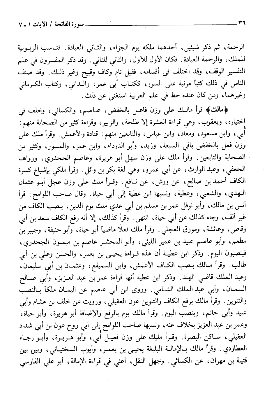 الرَّحْمَةِ، ثُمَّ ذَكَرَ شَيْئَيْنِ، أَحَدُهُمَا مِلْكُهُ يَوْمَ الْجَزَاءِ، وَالثَّانِي الْعِبَادَةُ. فَنَاسَبَ الرُّبُوبِيَّةَ للملك، وَالرَّحْمَةَ الْعِبَادَةُ. فَكَانَ الْأَوَّلُ لِلْأَوَّلِ، وَالثَّانِي لِلثَّانِي. وَقَدْ ذَكَرَ الْمُفَسِّرُونَ فِي عِلْمِ التَّفْسِيرِ الْوَقْفَ، وَقَدِ اخْتُلِفَ فِي أَقْسَامِهِ، فَقِيلَ تَامٌّ وَكَافٌّ وَقَبِيحٌ وَغَيْرُ ذَلِكَ. وَقَدْ صَنَّفَ النَّاسُ فِي ذَلِكَ كُتُبًا مُرَتَّبَةً عَلَى السور، ككتاب أبي عمر، والداني، وَكِتَابِ الْكِرْمَانِيِّ وَغَيْرِهِمَا، وَمَنْ كَانَ عِنْدَهُ حَظٌّ فِي عِلْمِ الْعَرَبِيَّةِ اسْتَغْنَى عَنْ ذَلِكَ.
