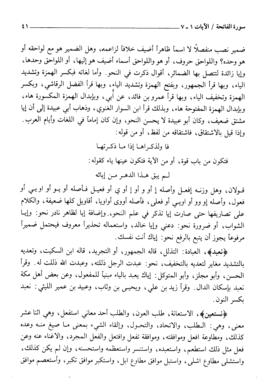 نَعْبُدُ، الْعِبَادَةُ: التَّذَلُّلُ، قَالَهُ الْجُمْهُورُ، أَوِ التَّجْرِيدُ، قَالَهُ ابْنُ السِّكِّيتِ، وَتَعَدِّيهِ بِالتَّشْدِيدِ مُغَايِرٌ لِتَعَدِّيهِ بِالتَّخْفِيفِ، نَحْوَ: عَبَّدْتُ الرَّجُلَ ذَلَّلْتُهُ، وَعَبَدْتُ اللَّهَ ذَلَلْتُ لَهُ. وَقَرَأَ الْحَسَنُ، وَأَبُو مِجْلِزٍ، وَأَبُو الْمُتَوَكِّلِ: إِيَّاكَ يُعْبَدُ بِالْيَاءِ مَبْنِيًّا لِلْمَفْعُولِ، وَعَنْ بَعْضِ أَهْلِ مَكَّةَ نَعْبُدْ بِإِسْكَانِ الدَّالِ. وَقَرَأَ زَيْدُ بْنُ عَلِيٍّ، وَيَحْيَى بْنُ وَثَّابٍ، وَعُبَيْدُ بْنُ عُمَيْرٍ اللَّيْثِيُّ: نَعْبُدُ بِكَسْرِ النُّونِ.