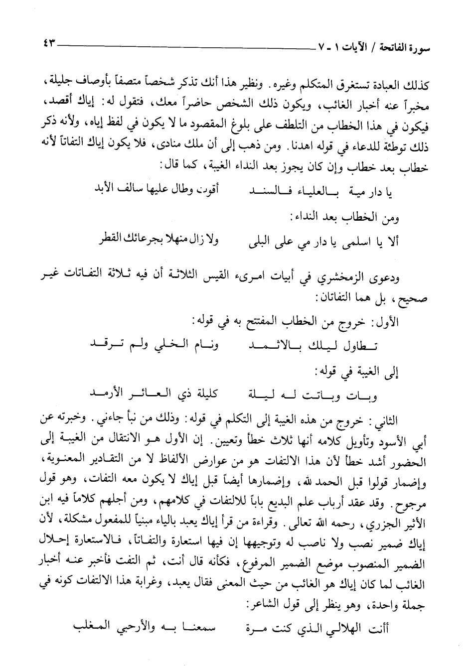 الثَّانِي: خُرُوجٌ مِنْ هَذِهِ الْغَيْبَةِ إِلَى التَّكَلُّمِ فِي قَوْلِهِ: وَذَلِكَ مِنْ نَبَأٍ جَاءَنِي. وَخَبَّرْتُهُ عَنْ أَبِي الْأَسْوَدِ وَتَأْوِيلُ كَلَامِهِ أَنَّهَا ثَلَاثٌ خَطَأٌ وَتَعْيِينُ. أَنَّ الْأَوَّلَ هُوَ الِانْتِقَالُ مِنَ الْغَيْبَةِ إِلَى الْحُضُورِ أَشَدُّ خَطَأً لِأَنَّ هَذَا الِالْتِفَاتَ هُوَ مِنْ عَوَارِضِ الْأَلْفَاظِ لَا مِنَ التَّقَادِيرِ الْمَعْنَوِيَّةِ، وَإِضْمَارُ قُولُوا قَبْلَ الْحَمْدِ لِلَّهِ، وَإِضْمَارُهَا أَيْضًا قَبْلَ إِيَّاكَ لَا يَكُونُ مَعَهُ الْتِفَاتٌ، وَهُوَ قَوْلٌ مَرْجُوحٌ. وَقَدْ عَقَدَ أَرْبَابُ عِلْمِ الْبَدِيعِ بَابًا لِلِالْتِفَاتِ فِي كَلَامِهِمْ، وَمِنْ أَجْلِهِمْ كَلَامًا فِيهِ ابْنُ الْأَثِيرِ الْجَزَرِيُّ، رَحِمَهُ اللَّهُ تَعَالَى. وَقِرَاءَةُ مَنْ قَرَأَ إِيَّاكَ يُعْبَدُ بِالْيَاءِ مَبْنِيًّا لِلْمَفْعُولِ مُشْكِلَةٌ، لِأَنَّ إِيَّاكَ ضَمِيرُ نَصْبٍ وَلَا نَاصِبَ لَهُ وَتَوْجِيهُهَا أَنَّ فِيهَا اسْتِعَارَةً وَالْتِفَاتًا، فَالِاسْتِعَارَةُ إِحْلَالُ الضَّمِيرِ الْمَنْصُوبِ مَوْضِعَ الضَّمِيرِ الْمَرْفُوعِ، فَكَأَنَّهُ قَالَ أَنْتَ، ثُمَّ الْتَفَتَ فَأَخْبَرَ عَنْهُ إِخْبَارَ الْغَائِبِ لَمَّا كَانَ إِيَّاكَ هُوَ الْغَائِبَ مِنْ حَيْثُ الْمَعْنَى فَقَالَ يُعْبَدُ، وَغَرَابَةُ هَذَا الِالْتِفَاتِ كَوْنُهُ فِي جُمْلَةٍ وَاحِدَةٍ، وَهُوَ يَنْظُرُ إِلَى قَوْلِ الشَّاعِرِ: