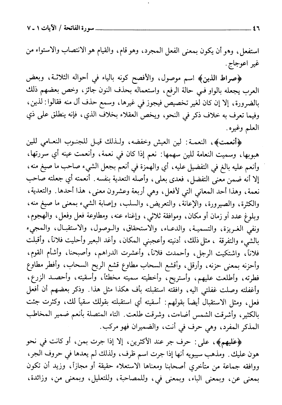 صِراطَ الَّذِينَ اسْمٌ مَوْصُولٌ، وَالْأَفْصَحُ كَوْنُهُ بِالْيَاءِ فِي أَحْوَالِهِ الثَّلَاثَةِ، وَبَعْضُ الْعَرَبِ يَجْعَلُهُ بِالْوَاوِ فِي حَالَةِ الرَّفْعِ، وَاسْتِعْمَالُهُ بِحَذْفِ النُّونِ جَائِزٌ، وَخَصَّ بَعْضُهُمْ ذَلِكَ بِالضَّرُورَةِ، إِلَّا إِنْ كَانَ لِغَيْرِ تَخْصِيصٍ فَيَجُوزُ فِي غَيْرِهَا، وَسُمِعَ حَذْفُ أَلْ منه فقالوا: لذين، وَفِيمَا تُعَرَّفُ بِهِ خِلَافٌ ذُكِرَ فِي النَّحْوِ، وَيُخَصُّ الْعُقَلَاءُ بِخِلَافِ الَّذِي، فَإِنَّهُ يَنْطَلِقُ عَلَى ذِي الْعِلْمِ وَغَيْرِهِ.